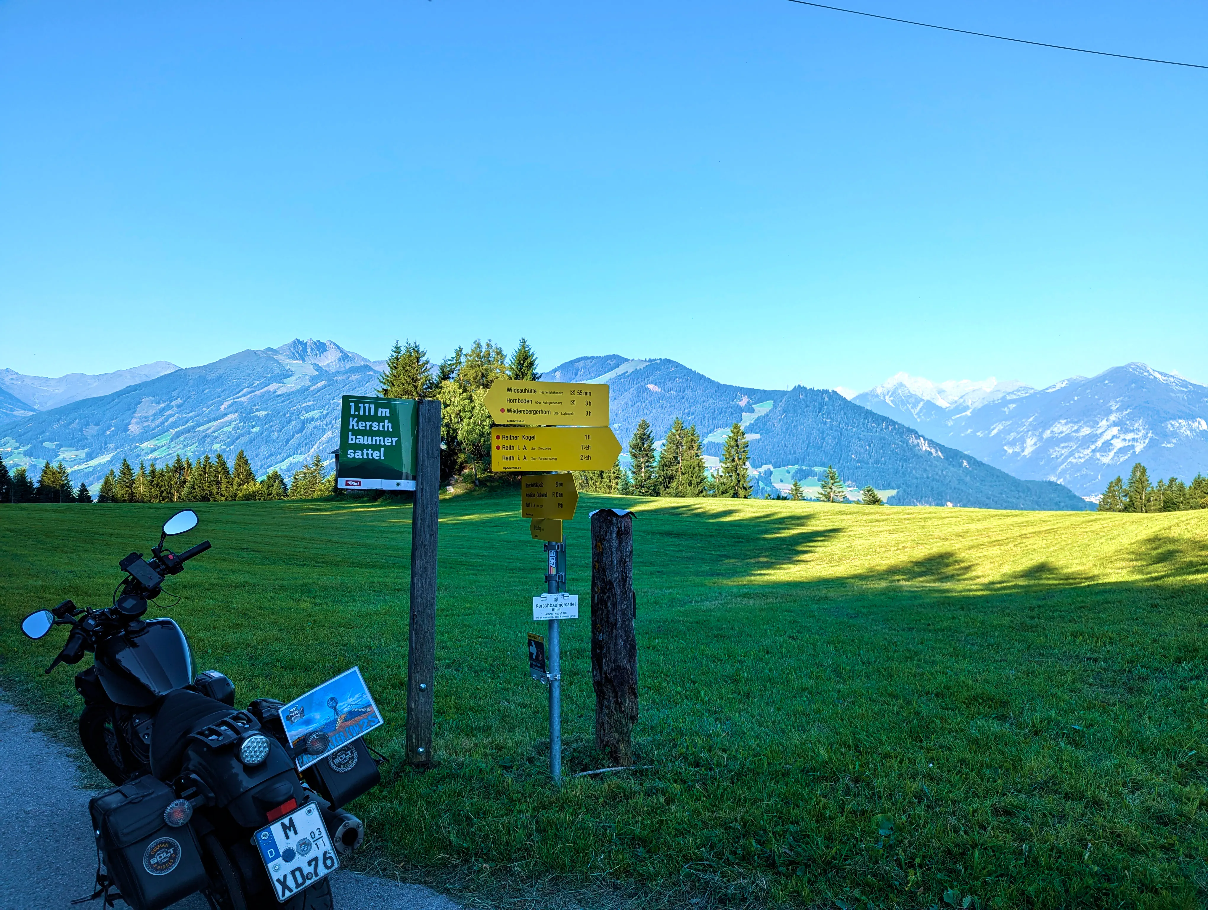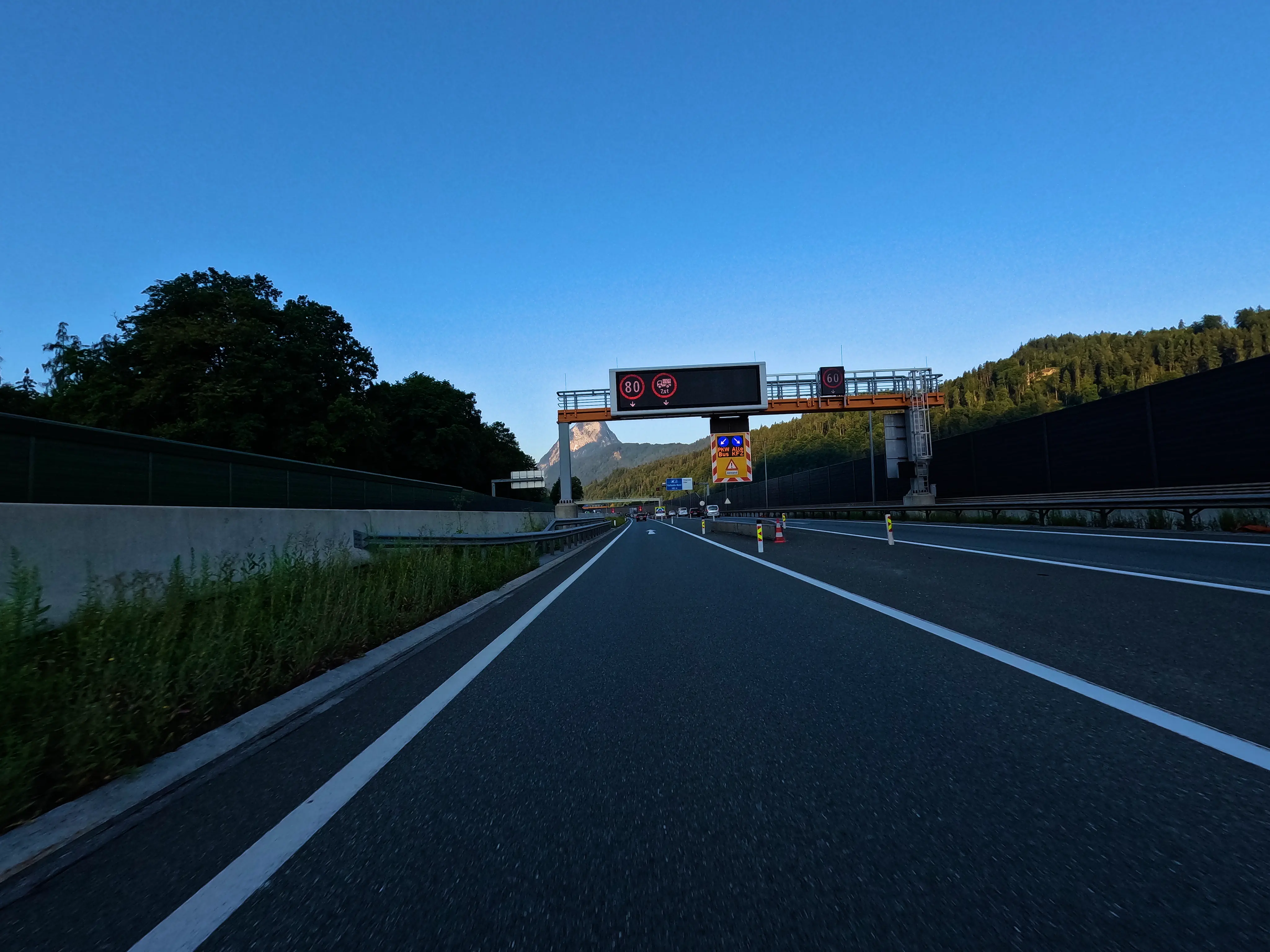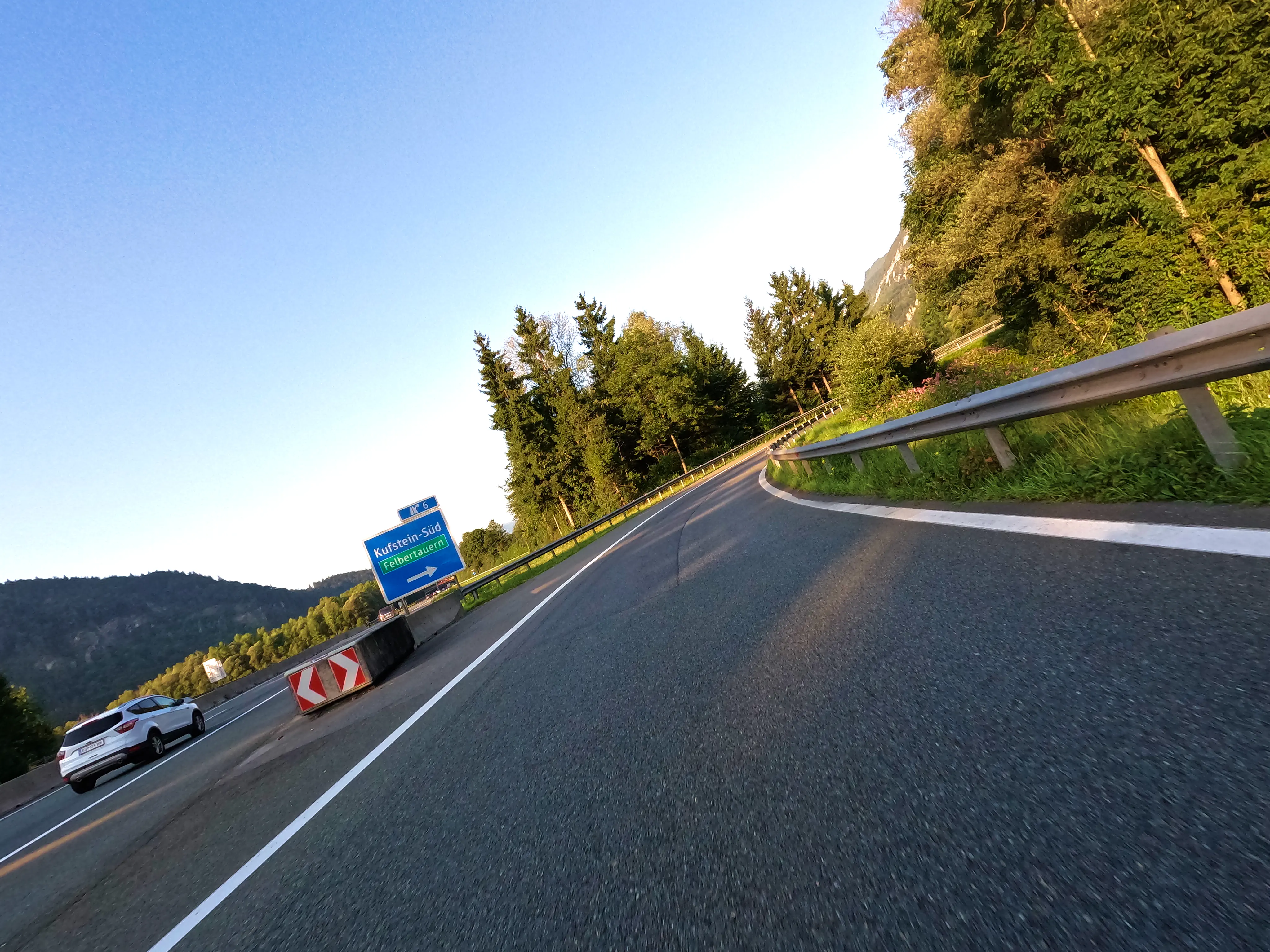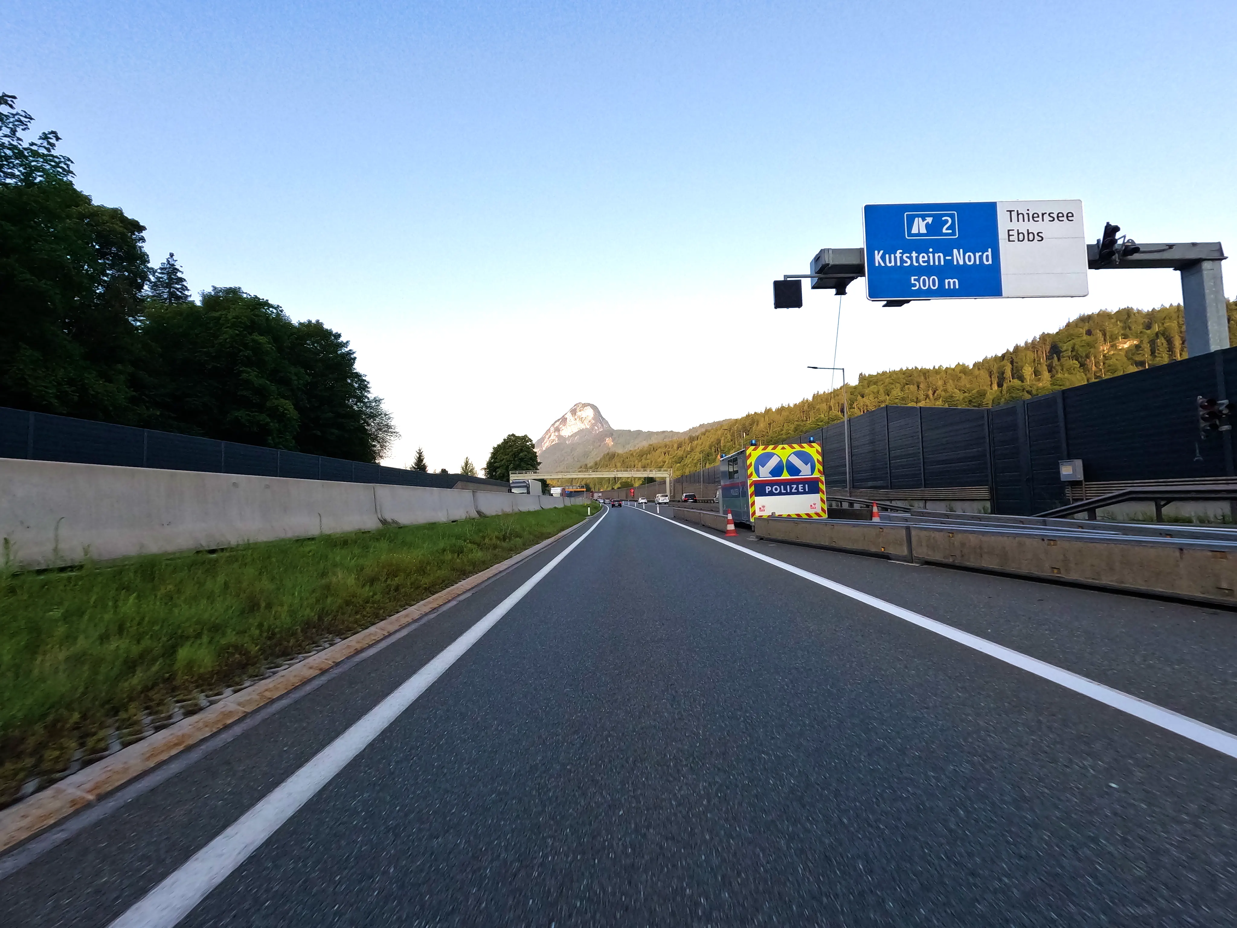 Ich startete die Bolt gegen halb sieben und fuhr direkt zur Autobahn-Auffahrt. Knapp 500 Kilometer hatte ich für diesen Tag geplant, bis Kufstein wollte ich schnell vorankommen und nahm daher den Weg über die A99, A8 und A93. Als ich den Irschenberg überquerte, stand die Sonne tief und tauchte die Landschaft in herrlich warmes Licht. Scheinbar waren zu diesem Zeitpunkt auch auf österreichischer Seite Container für Grenzkontrollen aufgebaut, diese wurden an diesem Samstag jedoch nicht genutzt. Ohne mautpflichtig geworden zu sein verließ ich die Autobahn schließlich bei Kufstein-Süd.