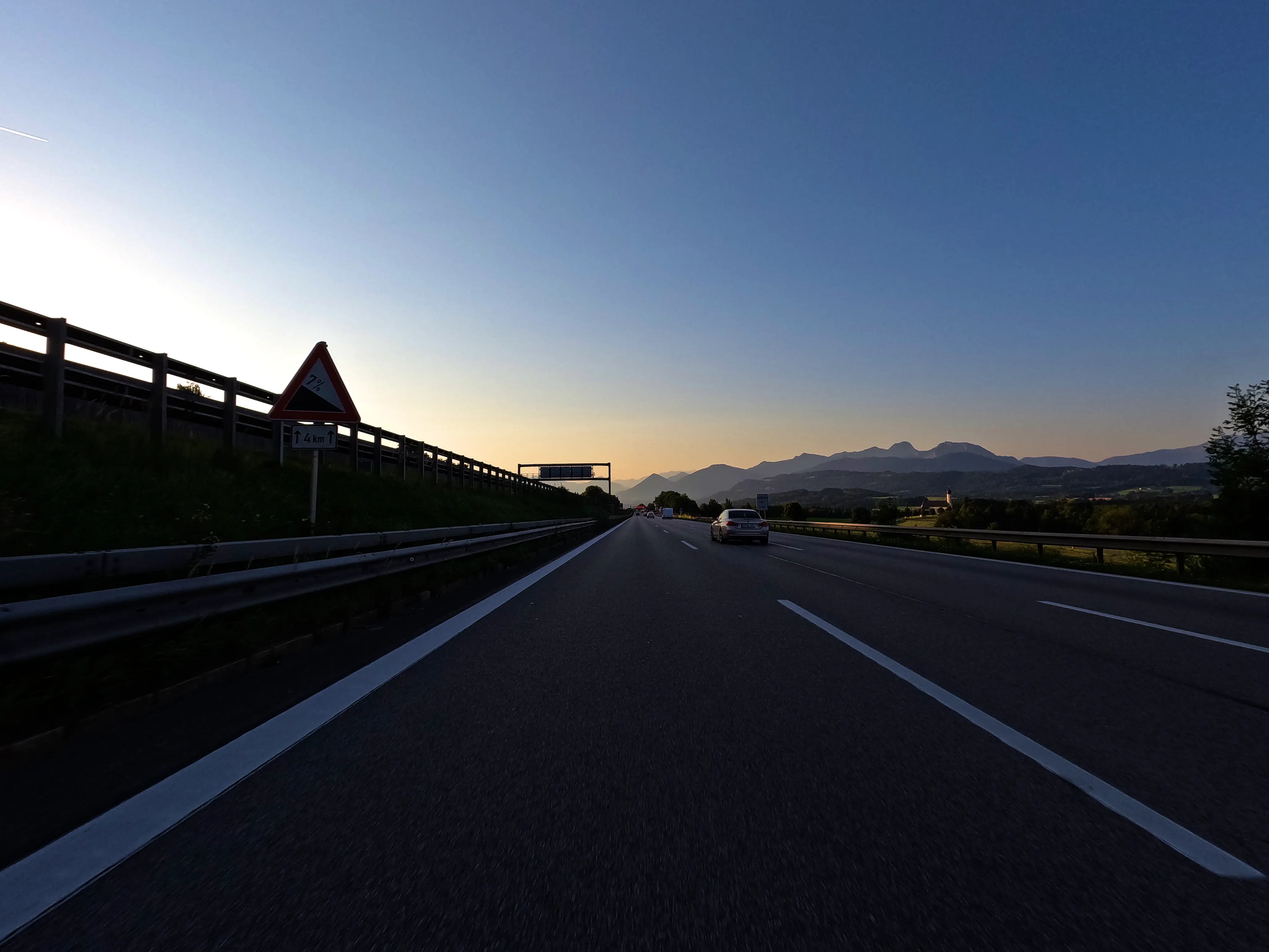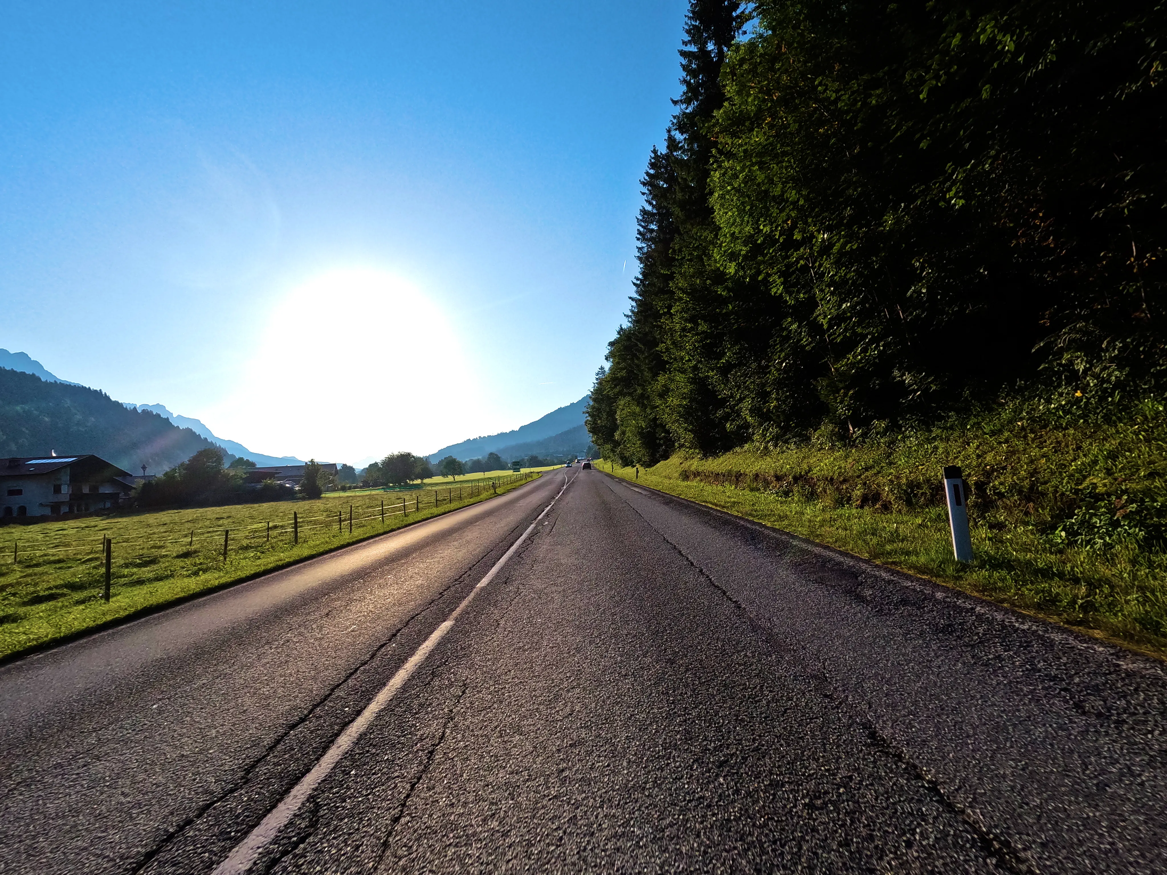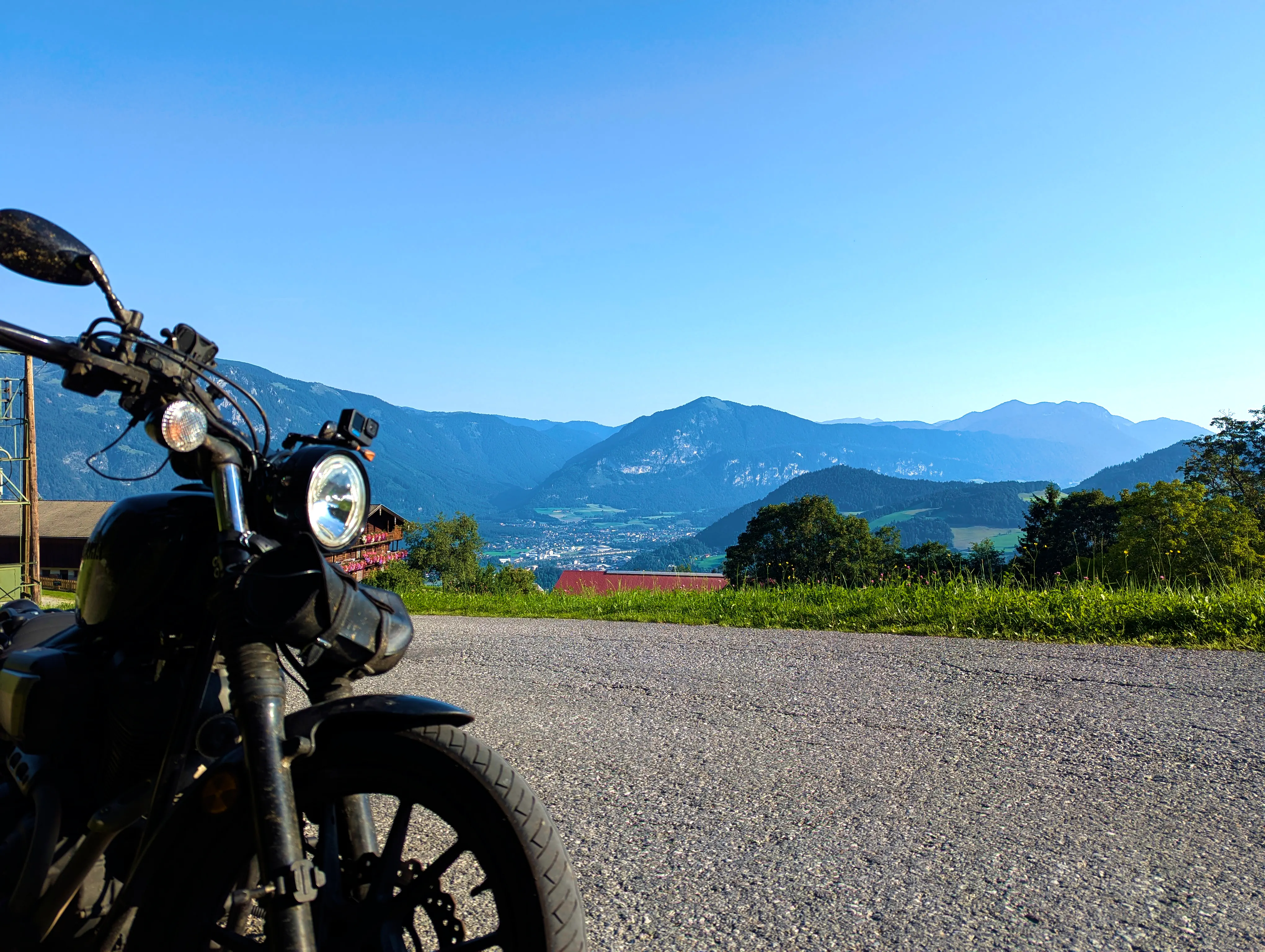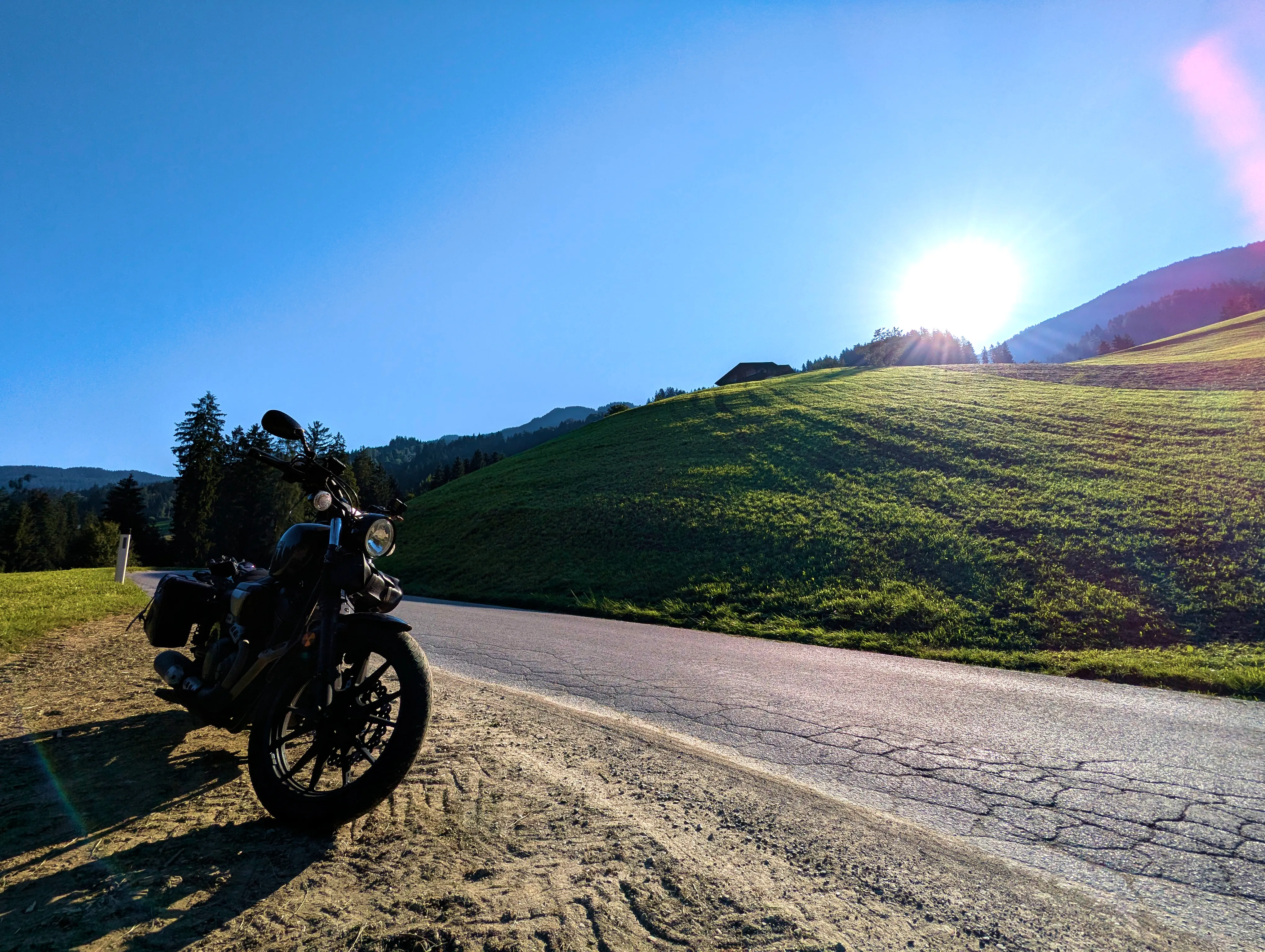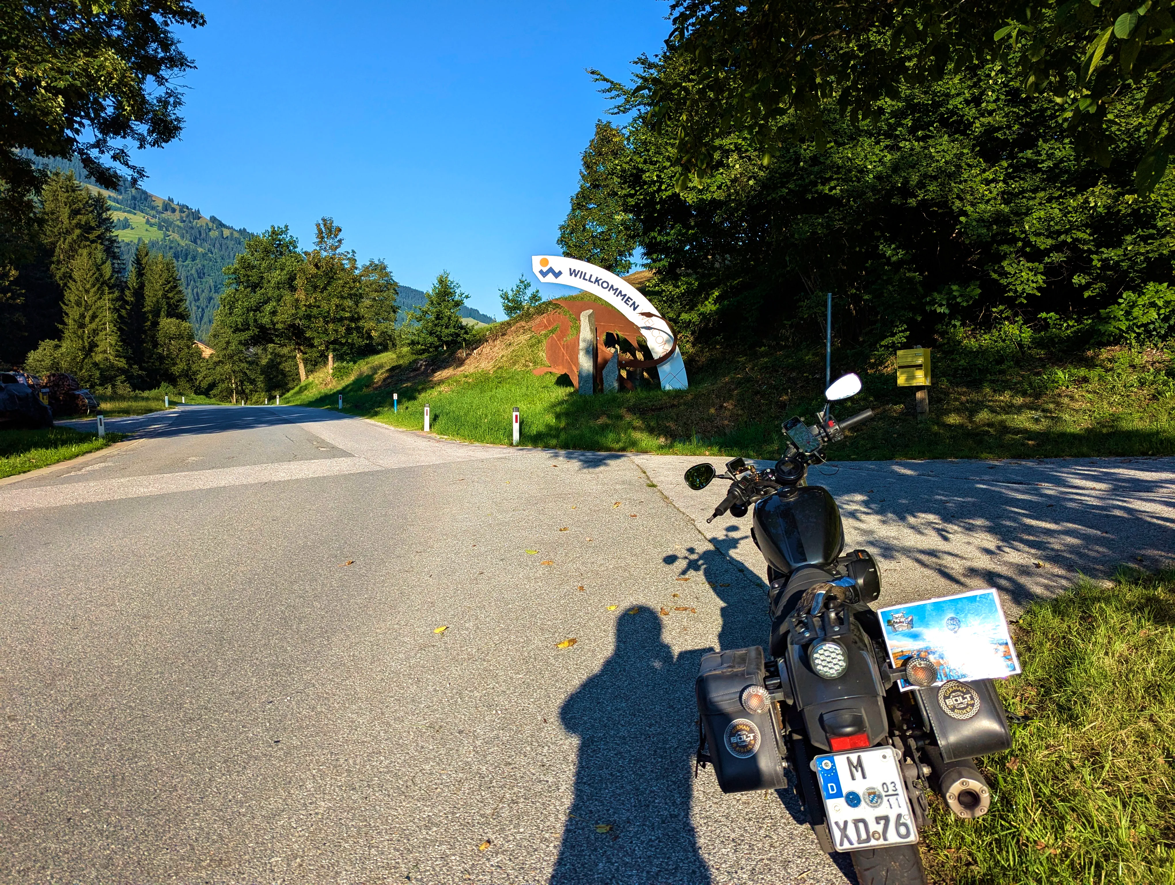 Ich startete die Bolt gegen halb sieben und fuhr direkt zur Autobahn-Auffahrt. Knapp 500 Kilometer hatte ich für diesen Tag geplant, bis Kufstein wollte ich schnell vorankommen und nahm daher den Weg über die A99, A8 und A93. Als ich den Irschenberg überquerte, stand die Sonne tief und tauchte die Landschaft in herrlich warmes Licht. Scheinbar waren zu diesem Zeitpunkt auch auf österreichischer Seite Container für Grenzkontrollen aufgebaut, diese wurden an diesem Samstag jedoch nicht genutzt. Ohne mautpflichtig geworden zu sein verließ ich die Autobahn schließlich bei Kufstein-Süd.