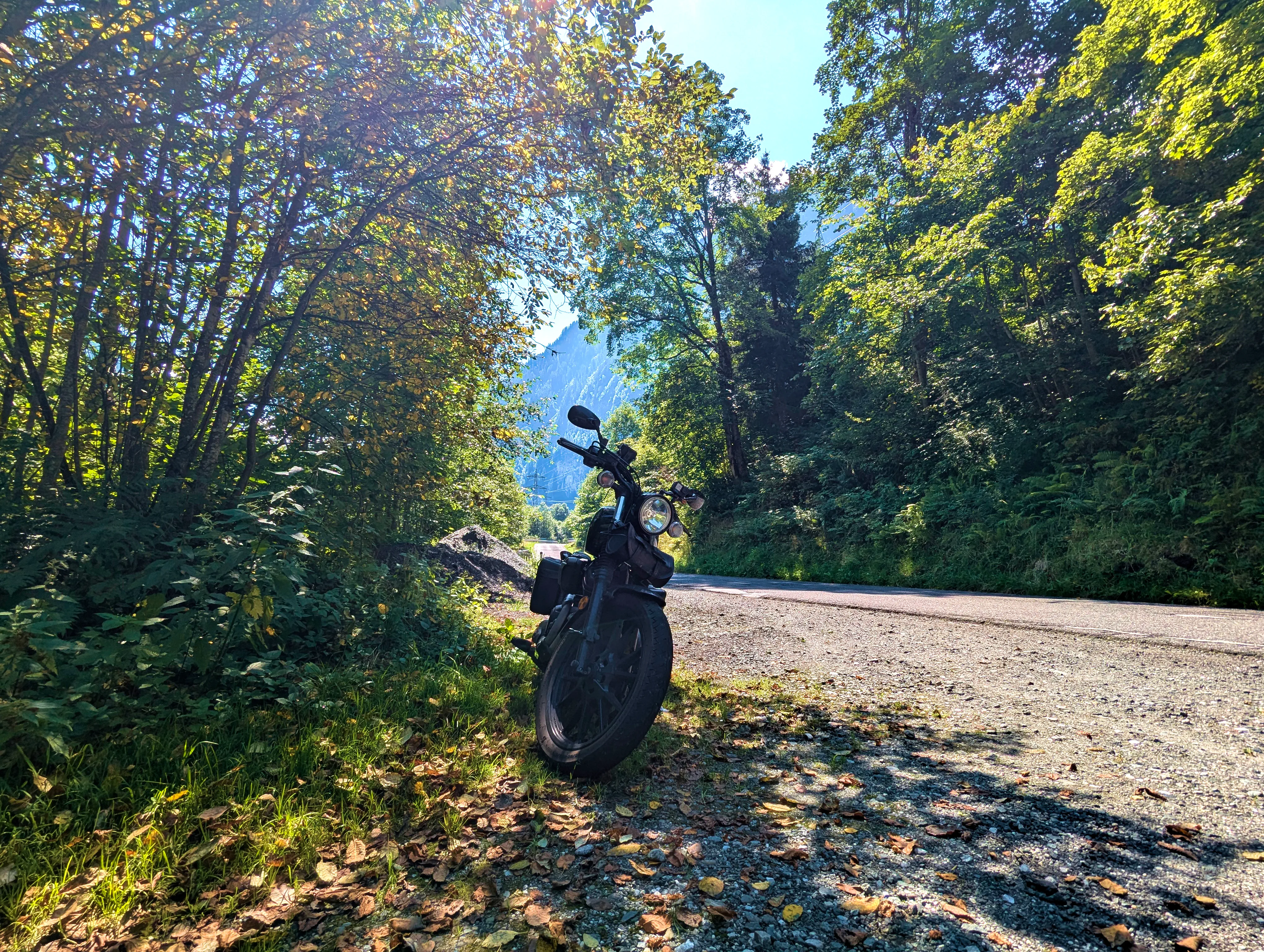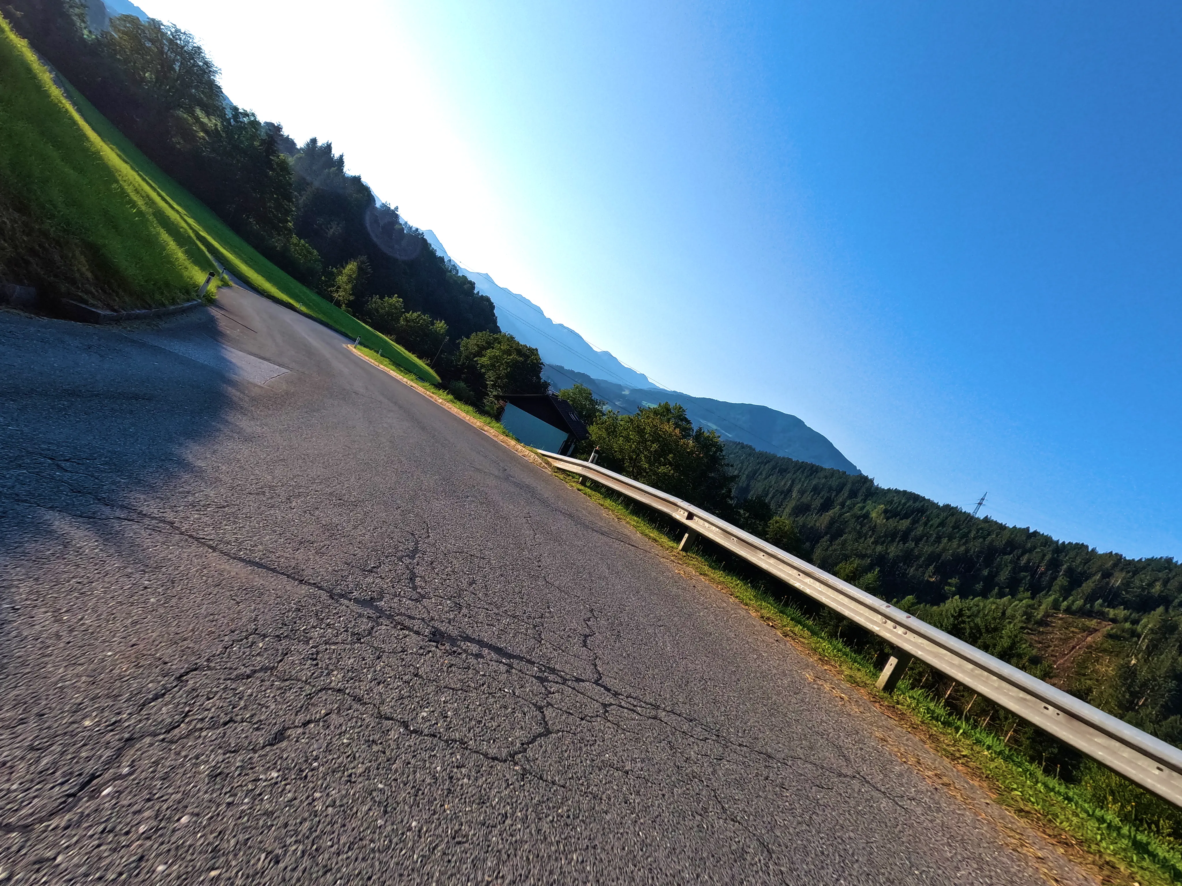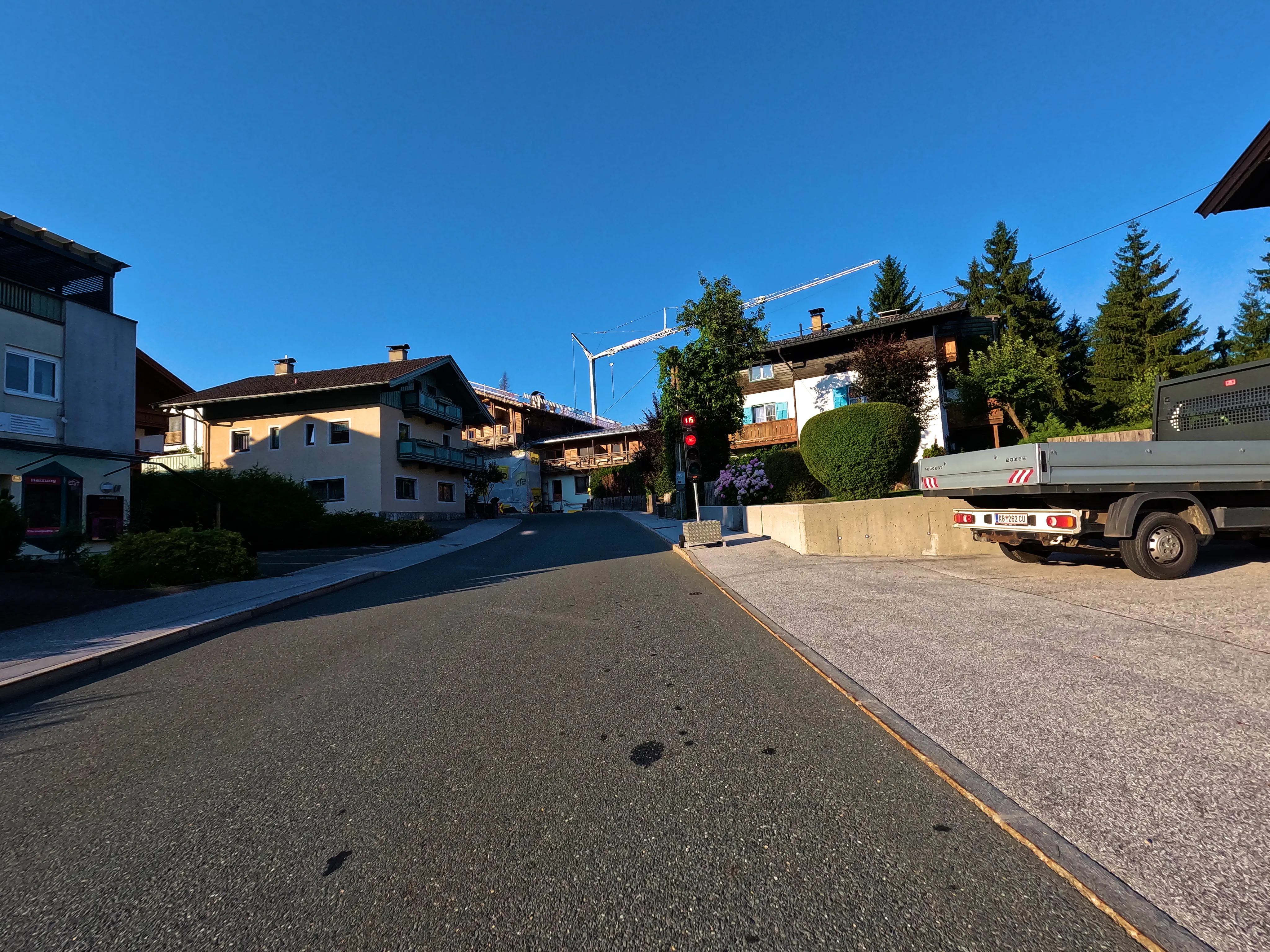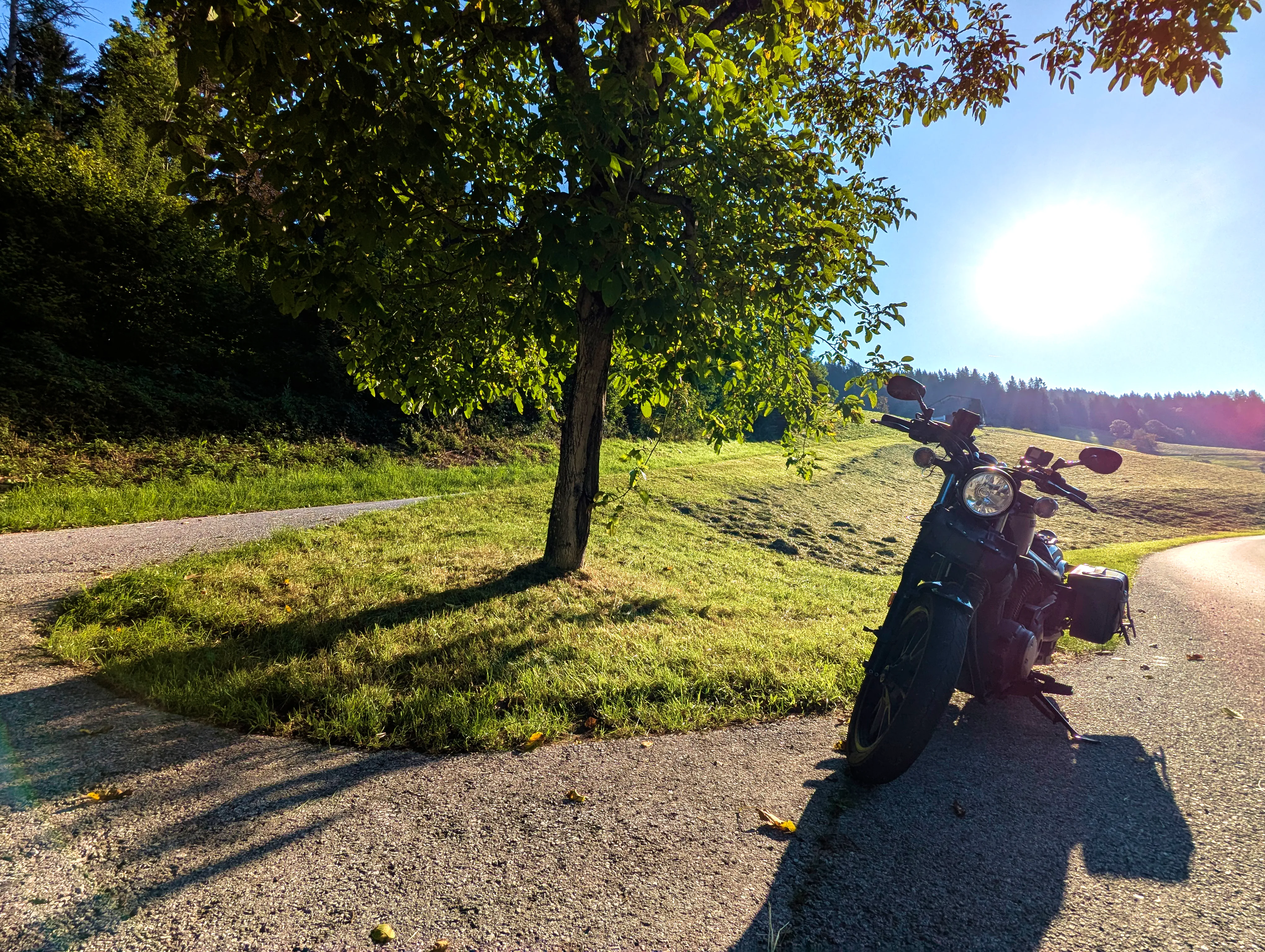 Ich startete die Bolt gegen halb sieben und fuhr direkt zur Autobahn-Auffahrt. Knapp 500 Kilometer hatte ich für diesen Tag geplant, bis Kufstein wollte ich schnell vorankommen und nahm daher den Weg über die A99, A8 und A93. Als ich den Irschenberg überquerte, stand die Sonne tief und tauchte die Landschaft in herrlich warmes Licht. Scheinbar waren zu diesem Zeitpunkt auch auf österreichischer Seite Container für Grenzkontrollen aufgebaut, diese wurden an diesem Samstag jedoch nicht genutzt. Ohne mautpflichtig geworden zu sein verließ ich die Autobahn schließlich bei Kufstein-Süd.