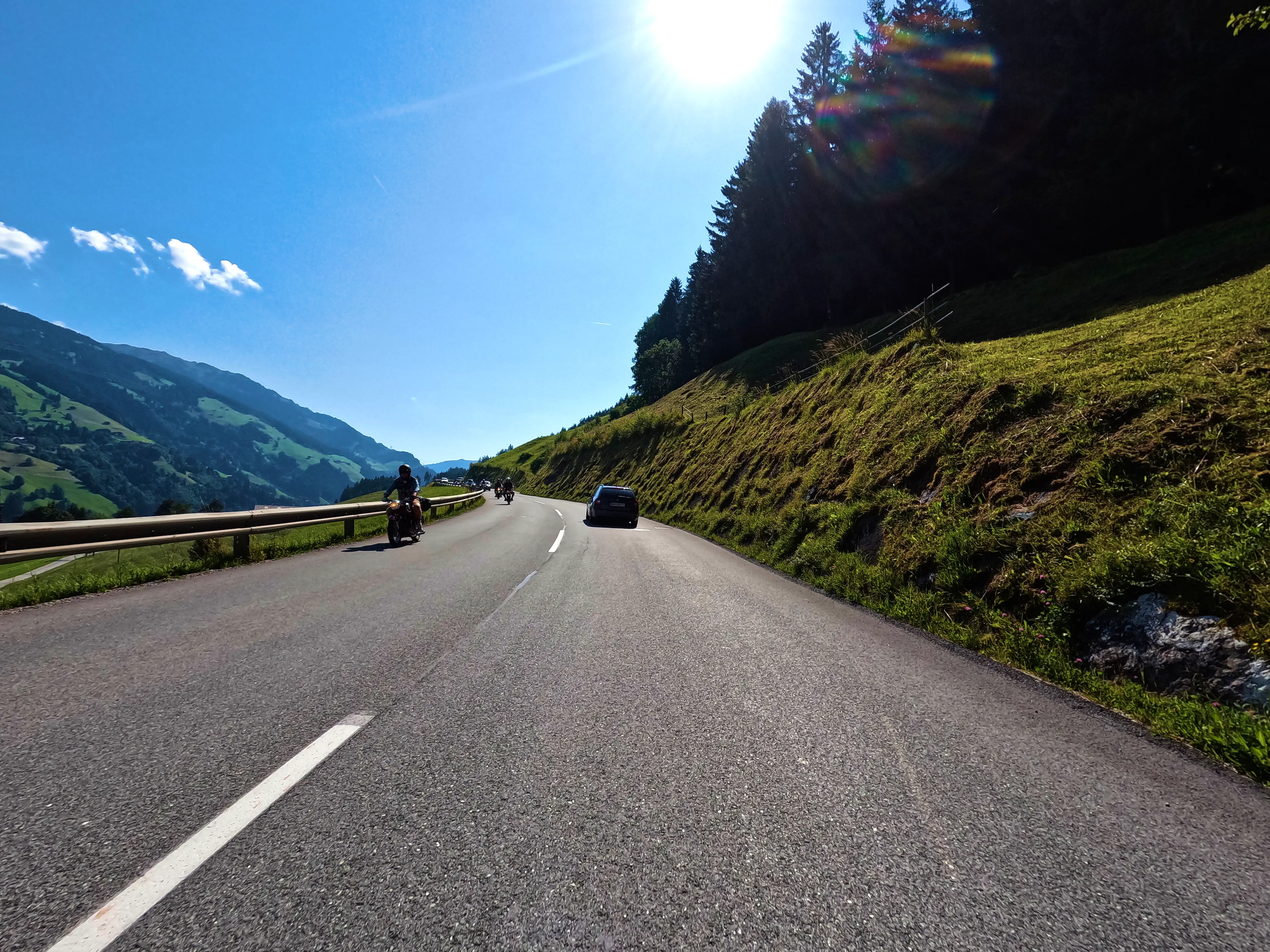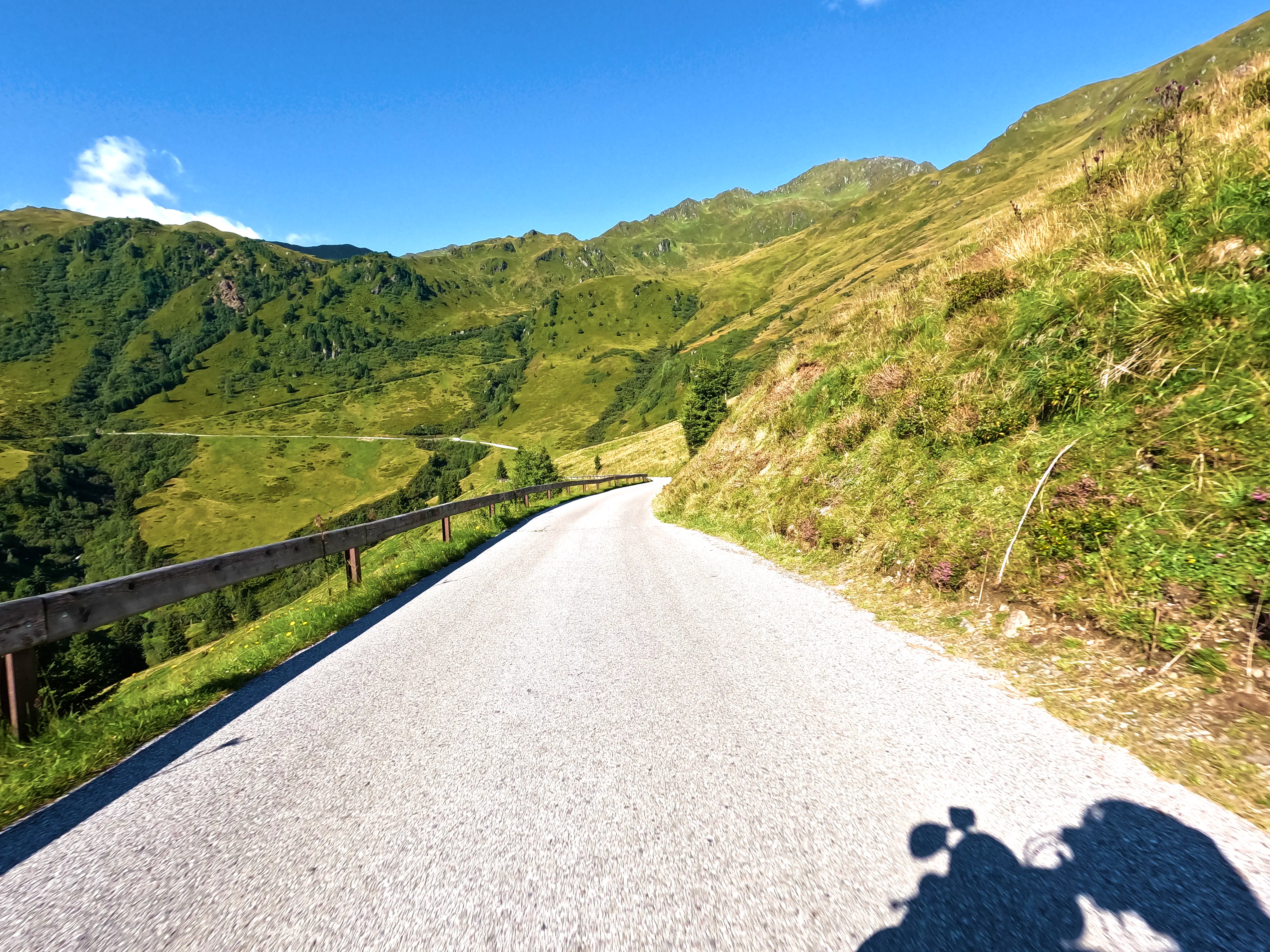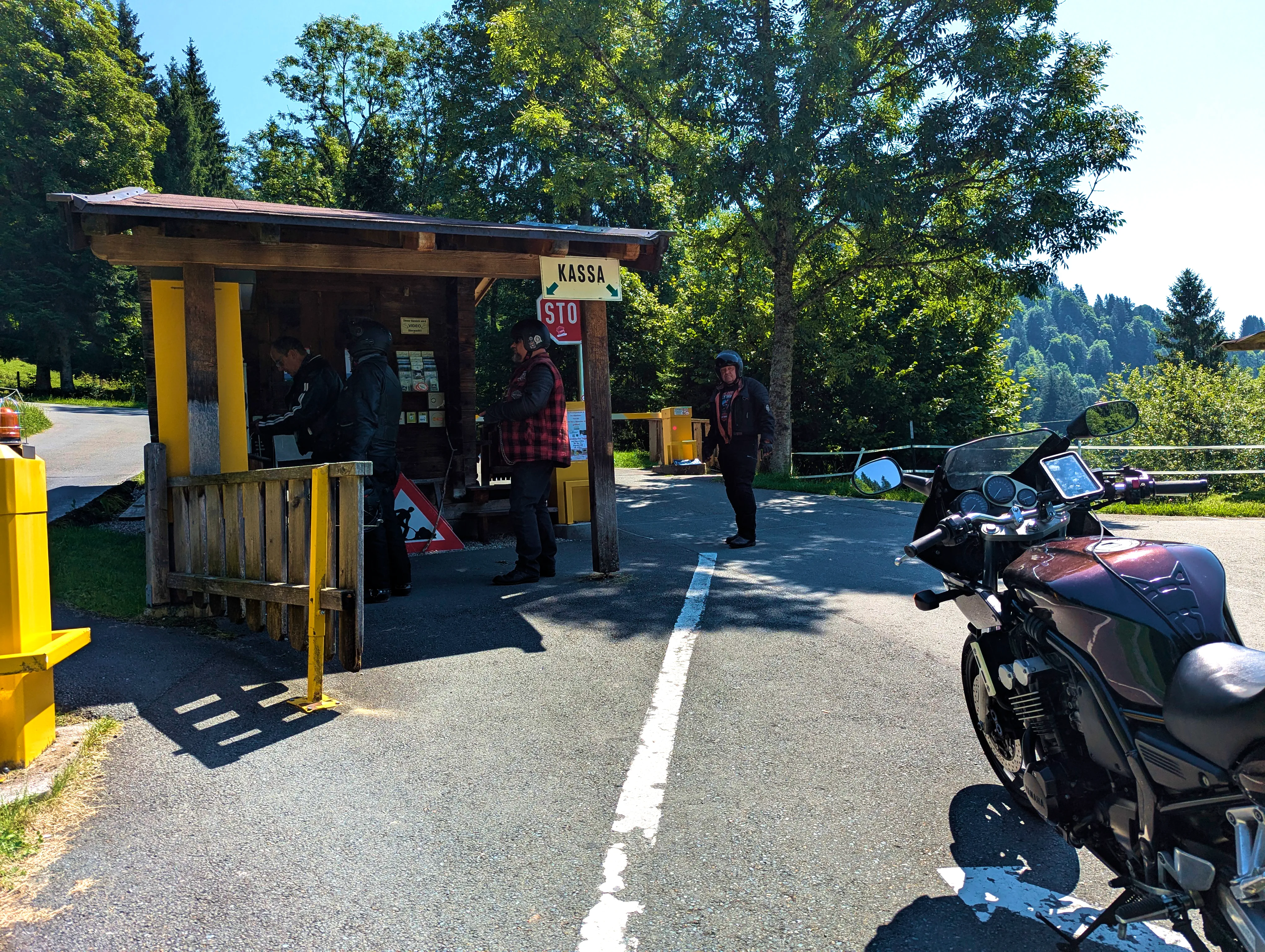 Ich verließ das Zillertal über den Gerlospass Richtung Osten. Auf der B165 kam mir zuerst eine Gruppe Kleinkrafträder bzw. Mopeds entgegen, die schienen auch Spaß zu haben - allerdings bremsten sie den Verkehr doch etwas aus. Egal, ich war ja schließlich in der entgegengesetzten Richtung unterwegs. Und auch wenn die B165 manchmal etwas anstrengend ist, ich war wohl noch früh genug dran oder hatte gerade eine günstige Zeit erwischt. Jedenfalls war nicht besonders viel los, ich konnte gemütlich fahren, ohne ständig hinter Autos zu kleben. Ich fuhr die Mautstation am neuen Gerlospass an, machte mein Nachweisbild und drehte wieder um, um die alte Gerlosstraße Richtung Osten zu fahren. Bei Königsleiten befuhr ich schließlich die alte Gerlosstraße, welche mich zuerst zum sechsten Passknacker-Punkt des Tages, anschließend zu einigen schönen Fotospots und schließlich ins Pinzgau brachte.