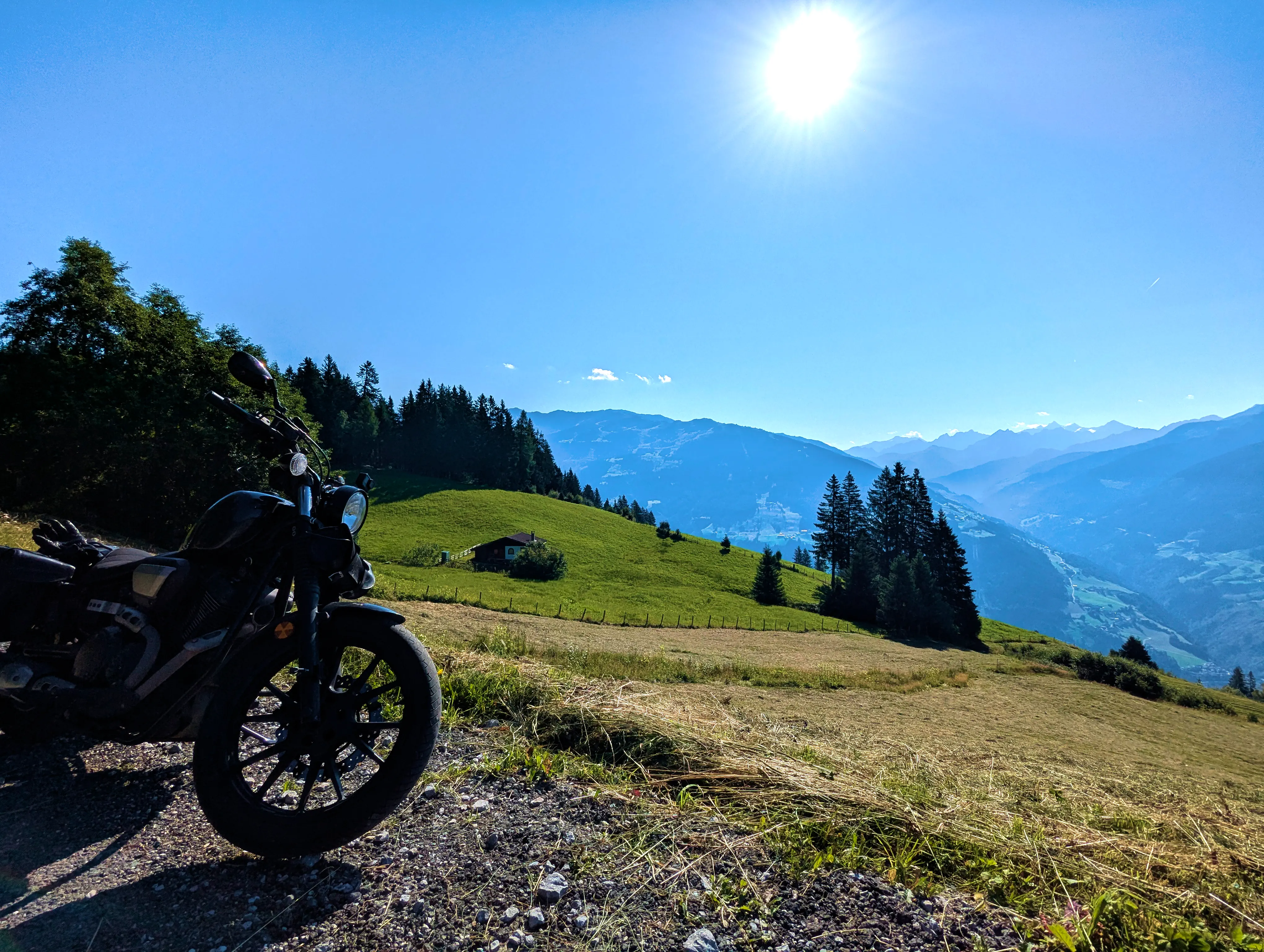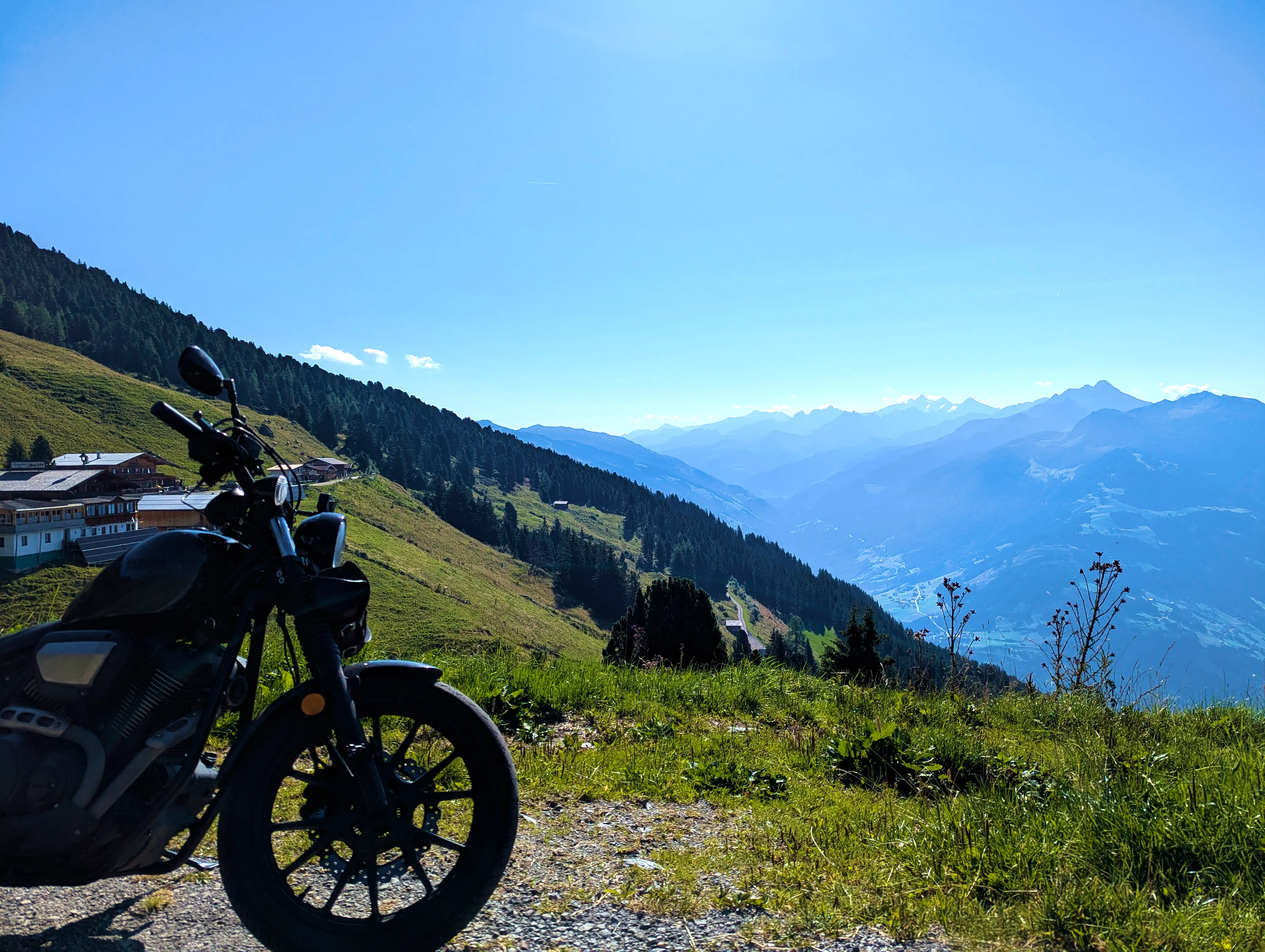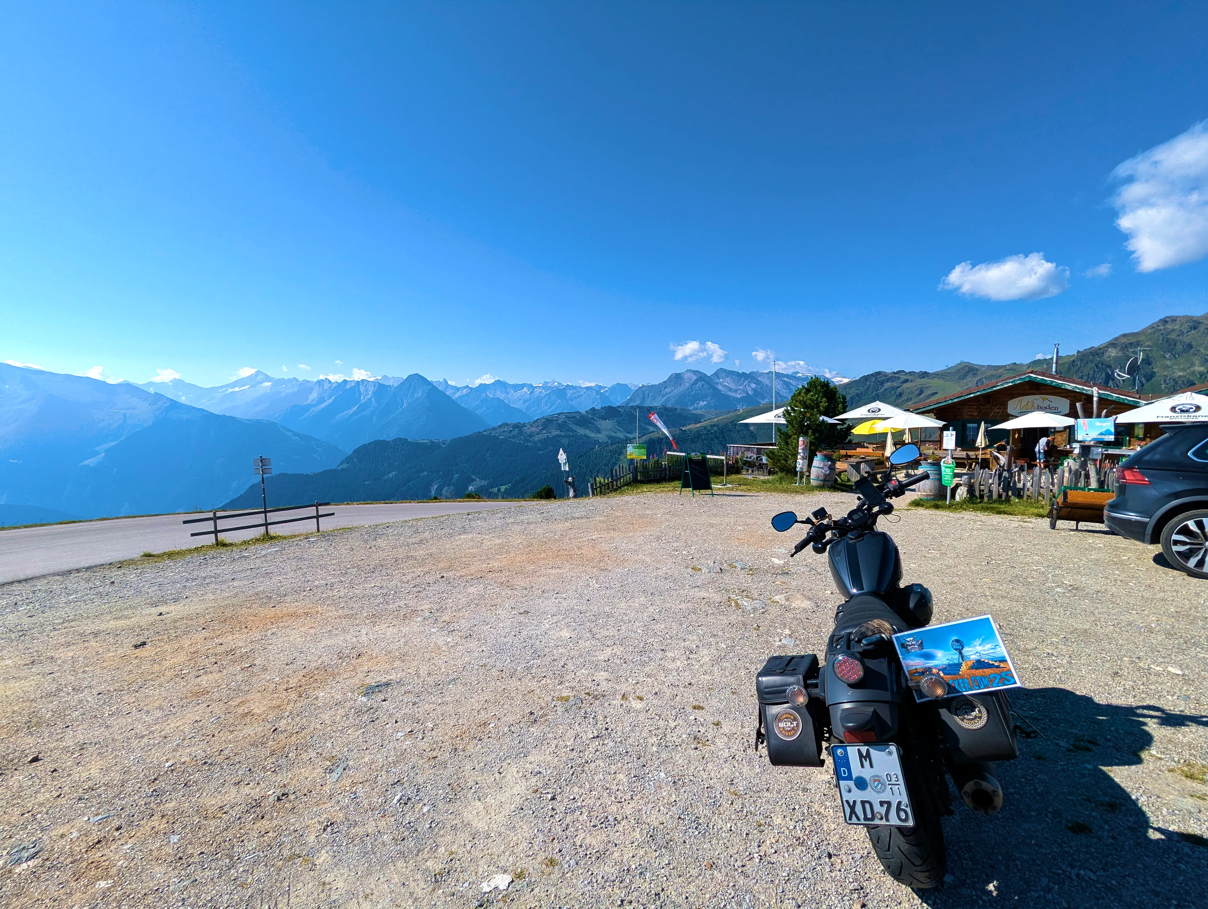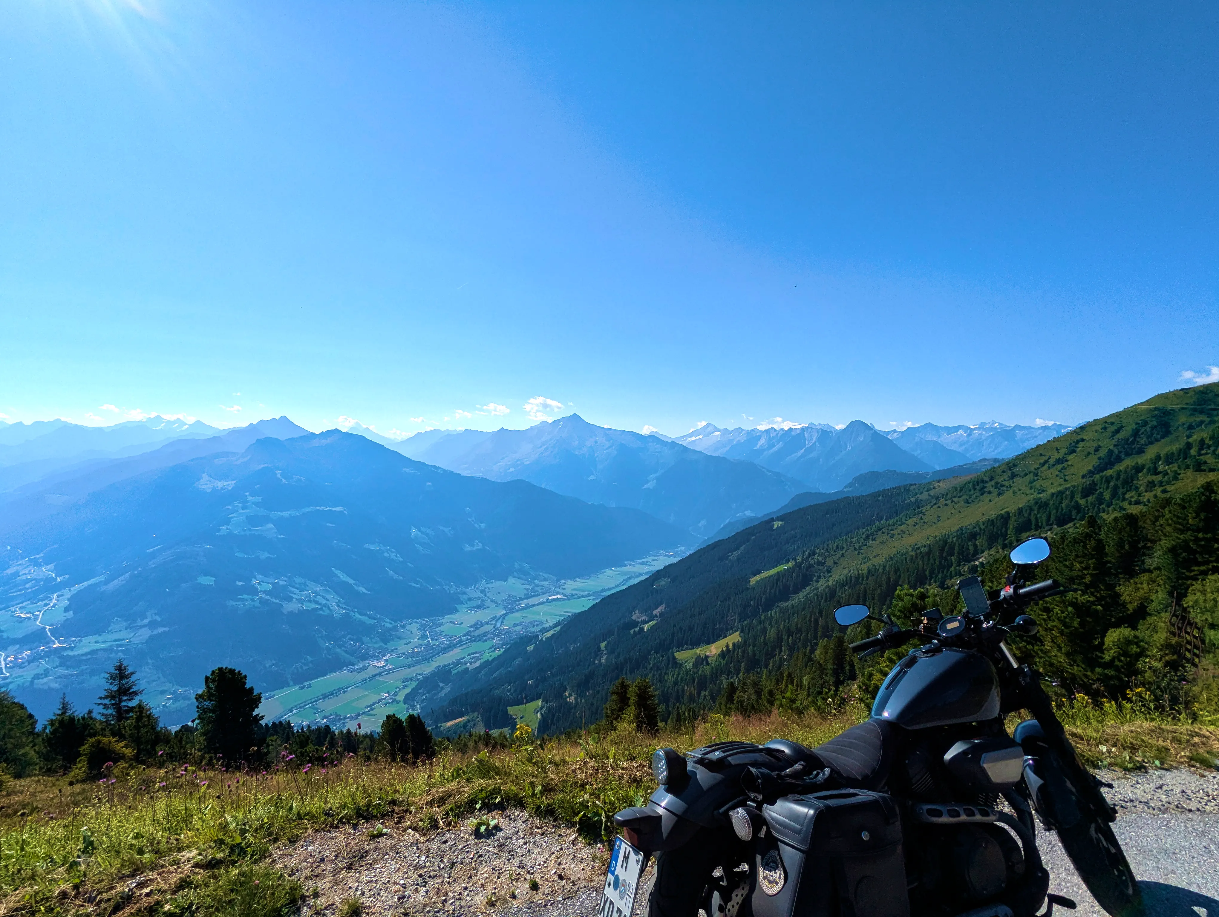 Nun stand mir wieder eine etwas stärker befahrene Etappe bevor. Bei Fügen bog ich auf die B169 Richtung Süden durch das Zillertal ein, verließ diese aber nach einem Tankstopp und zehn Kilometer später bereits wieder, als ich in Aschau im Zillertal zur Auffahrt zur Zillertaler Höhenstraße abbog. Die Zillertaler Höhenstraße war wie immer ein Highlight. Toller Aussichten, schmale Wege, eigentlich hätte ich alle 100 Meter anhalten können, um ein paar Fotos zu machen. Das Wetter an diesem Samstag tat sein übriges: Strahlend blauer Himmel, am Horizont ein paar wenige weiße Wölkchen, angenehm sommerliche Temperatur. Traumhaft! Am Melchboden hielt ich an, um das vierte Nachweisbild dieses Tages auf meinem Telefon zu speichern. Um kurz vor 10 Uhr war hier noch nicht besonders viel los, ich fuhr dennoch zügig weiter. Die letzten Kilometer der Abfahrt nach Hippach hatte ich dann leider einen Bus vor mir, der zwar recht zügig fuhr, dabei teilweise aber doch sehr waghalsige Manöver veranstaltete.