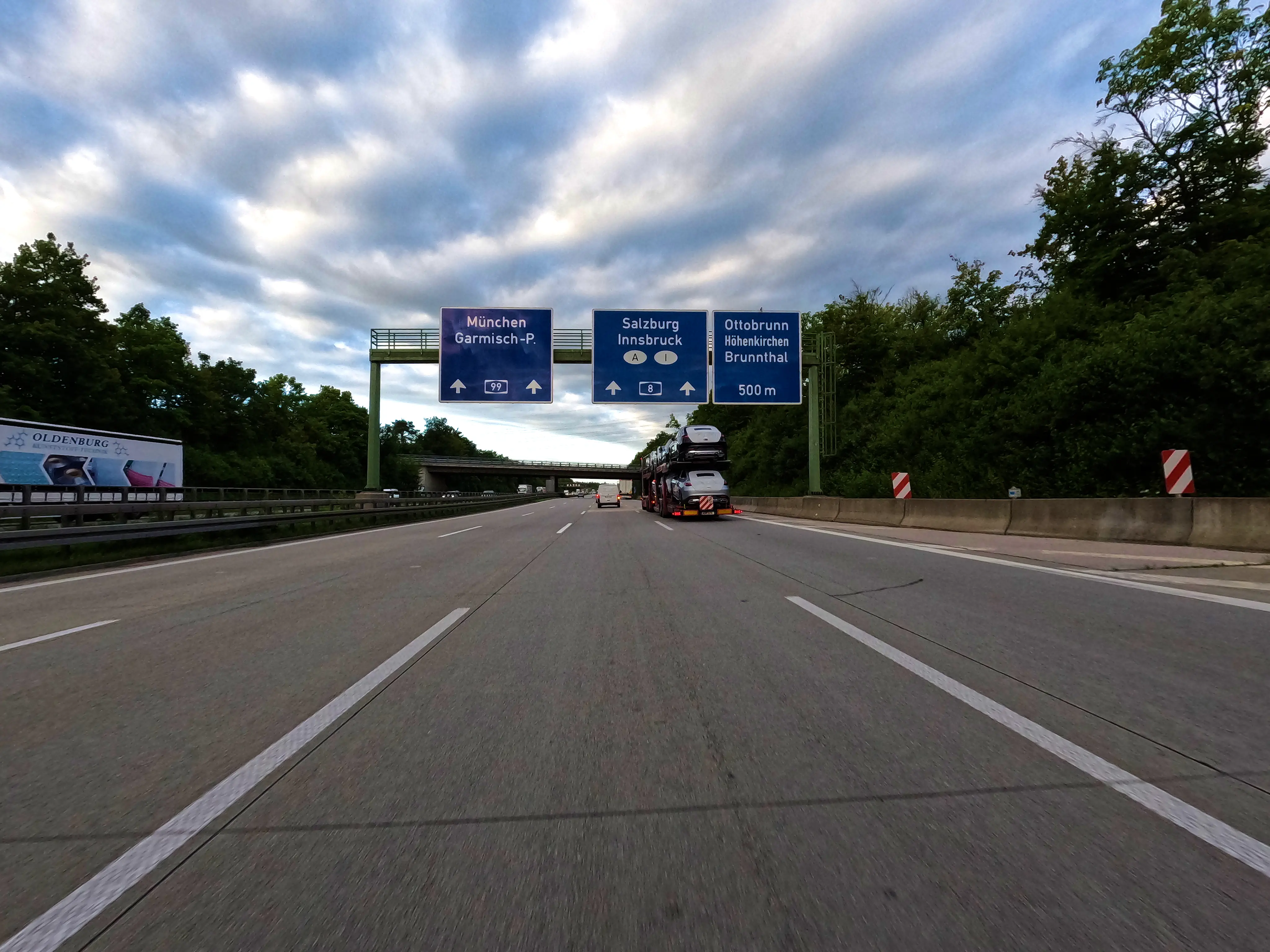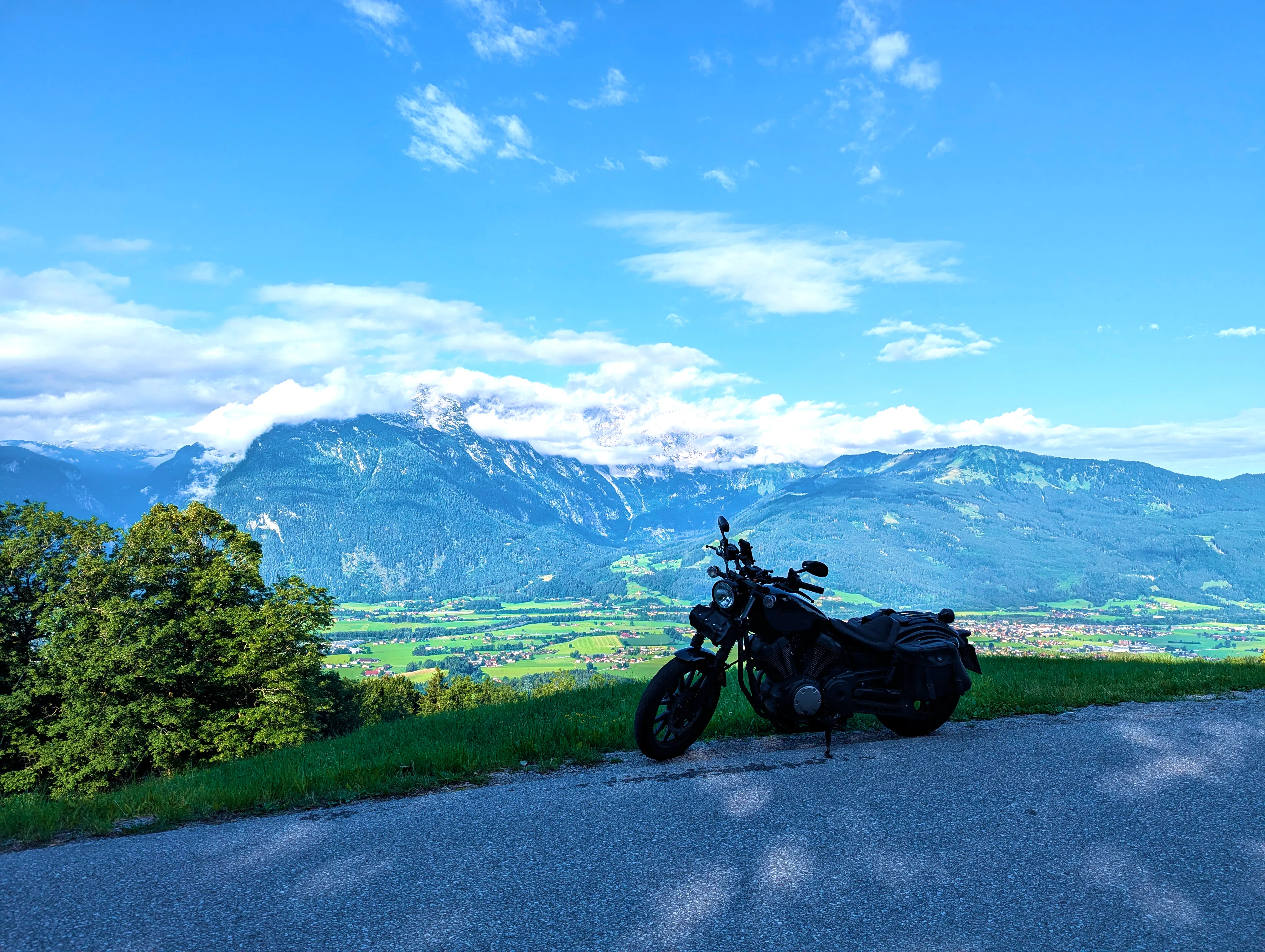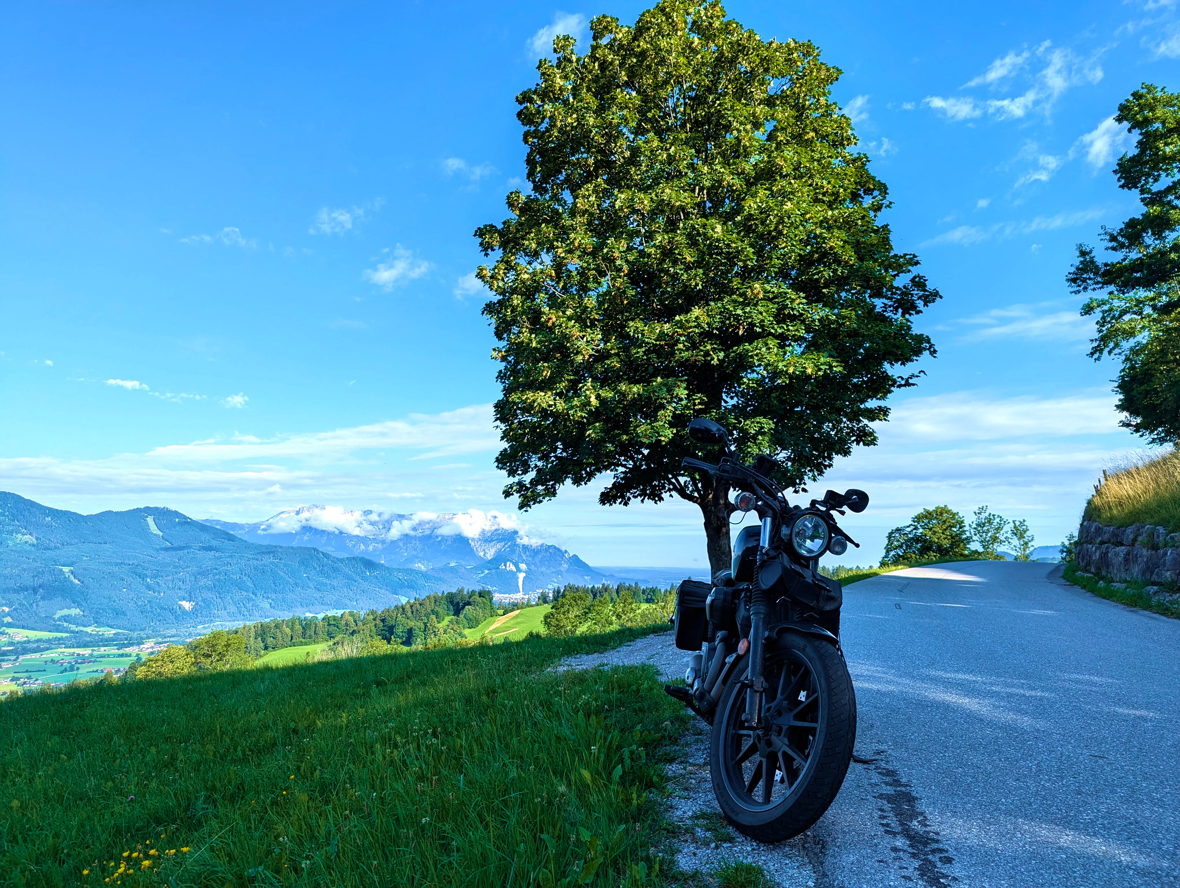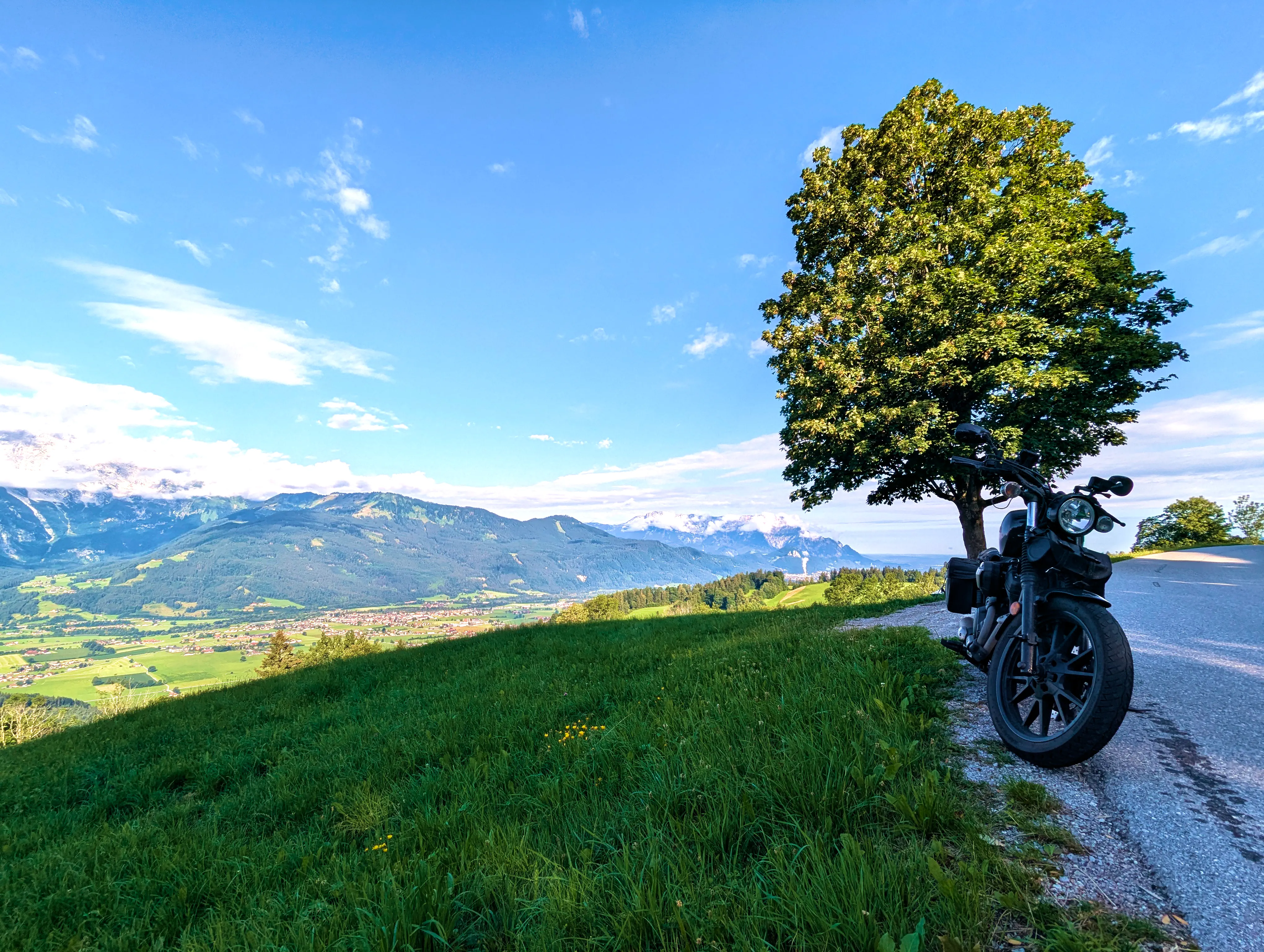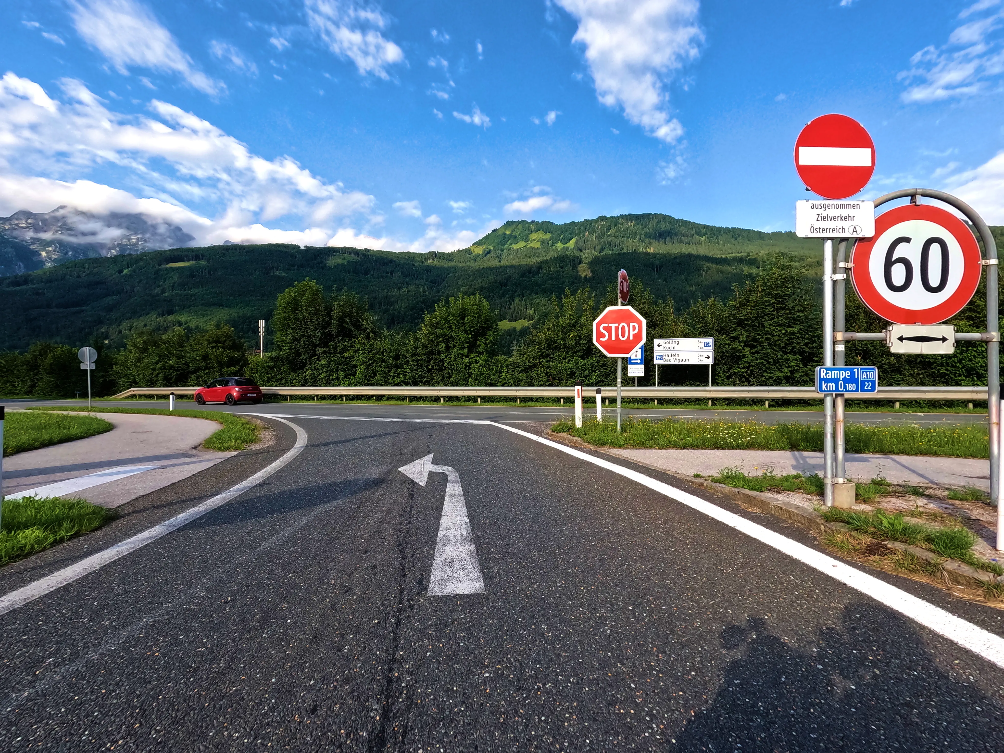 Ich entschied mich bei der Zusammenstellung der Passknacker-Punkte für diese Tour dafür, den Weg bis zum ersten Zwischenziel so weit wie möglich über die Autobahn zu absolvieren. Es war Mittwoch, ich hatte Urlaub, allerdings abends noch einen Termin - daher schnell zum Ziel, dann entspannt zurück. Ich fuhr direkt auf die A99, wechselte auf die A8 und hielt immer Richtung Salzburg. Gegen 7 Uhr war ich am Irschenberg, wie immer ein herrlicher Anblick beim Blick Richtung Osten. Die Grenze nach Österreich überquerte ich um kurz vor 8 Uhr. Kurz darauf geriet ich auf der A10 Richtung Hallein in etwas zähen Verkehr, nach wenigen Minuten ging es aber auch wieder flüssig weiter. Die Autobahn verließ ich bei Kuchl, wo ich, wie immer in Österreich, etwas von der Beschilderung verwirrt war - die Schilder hinterlassen immer kurz den Eindruck, als dürfte man hier nicht die Autobahn verlassen.