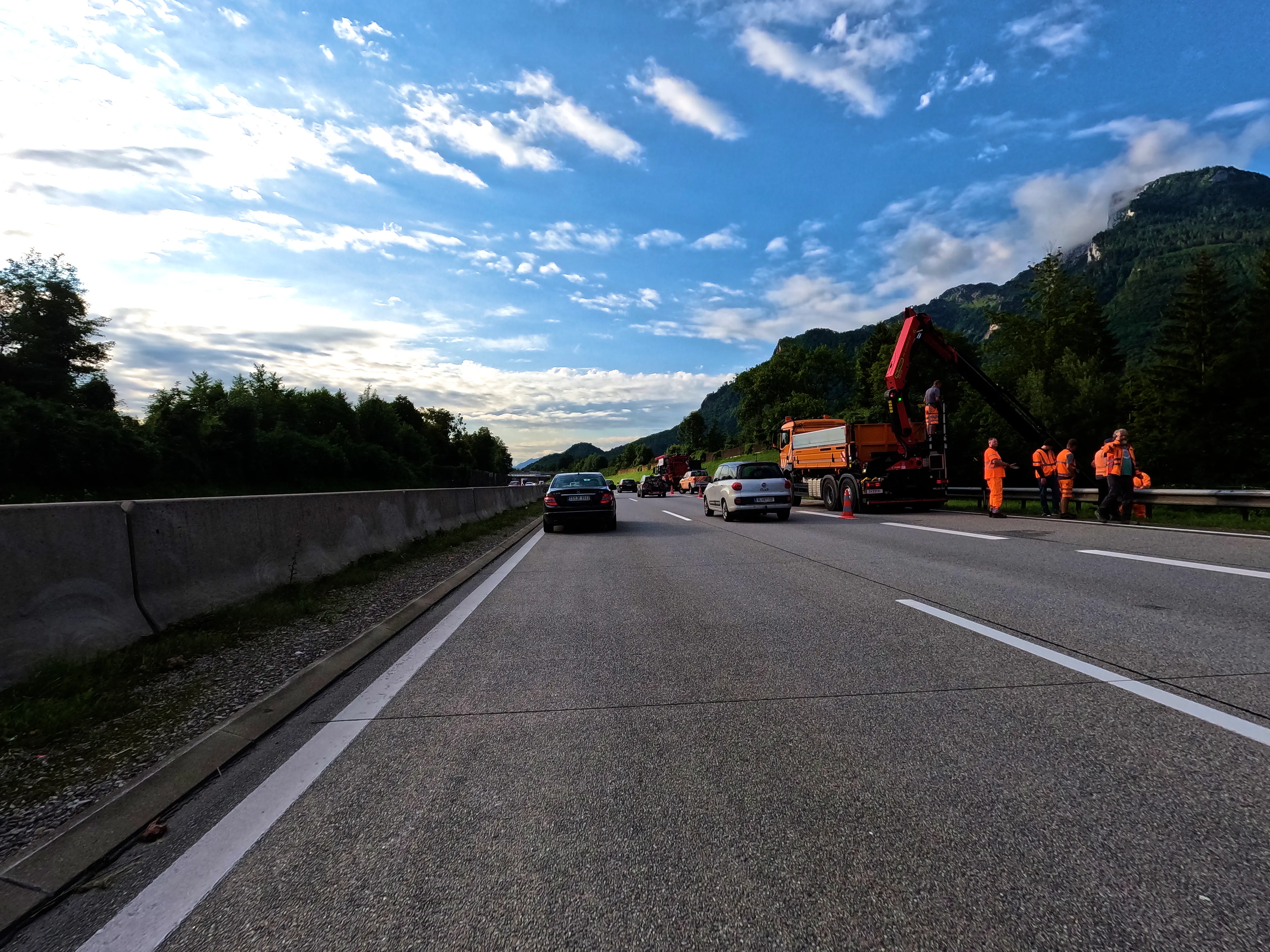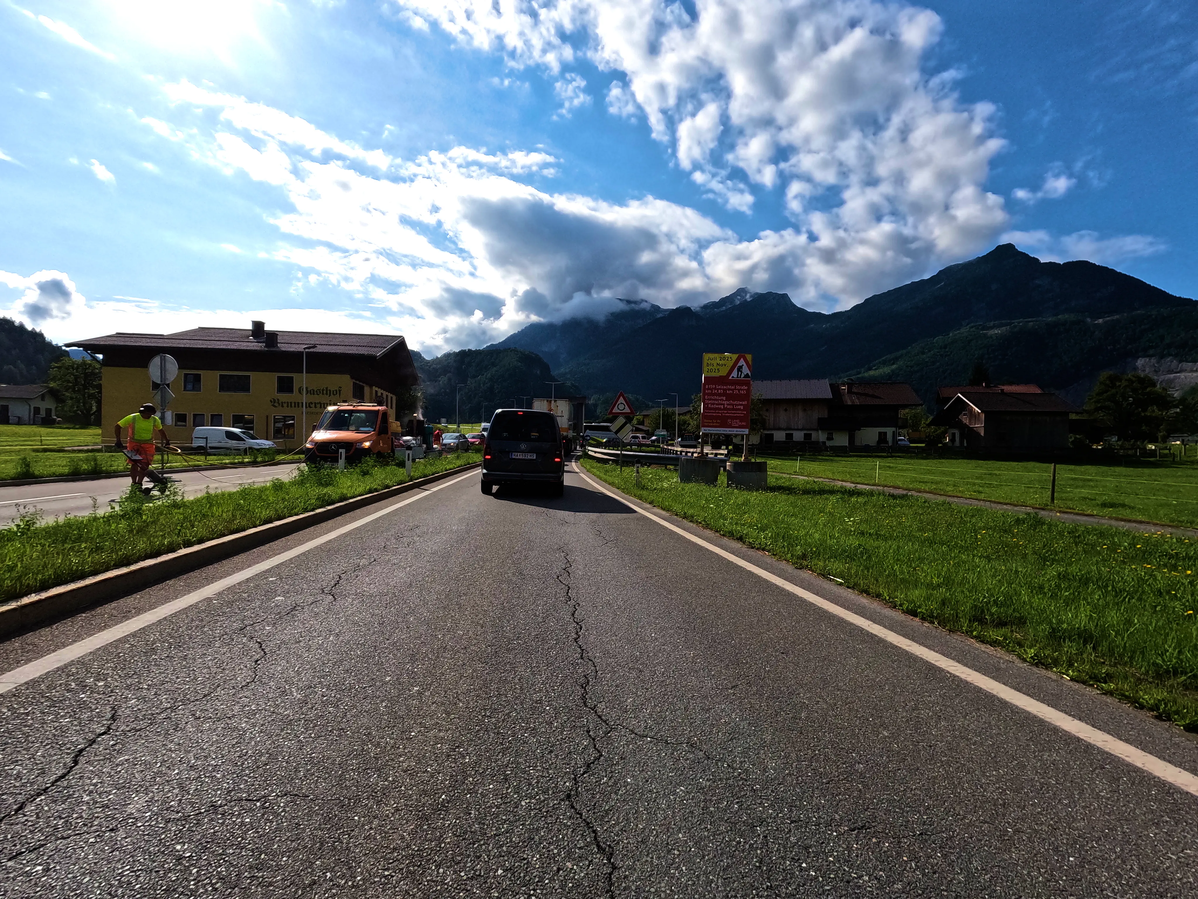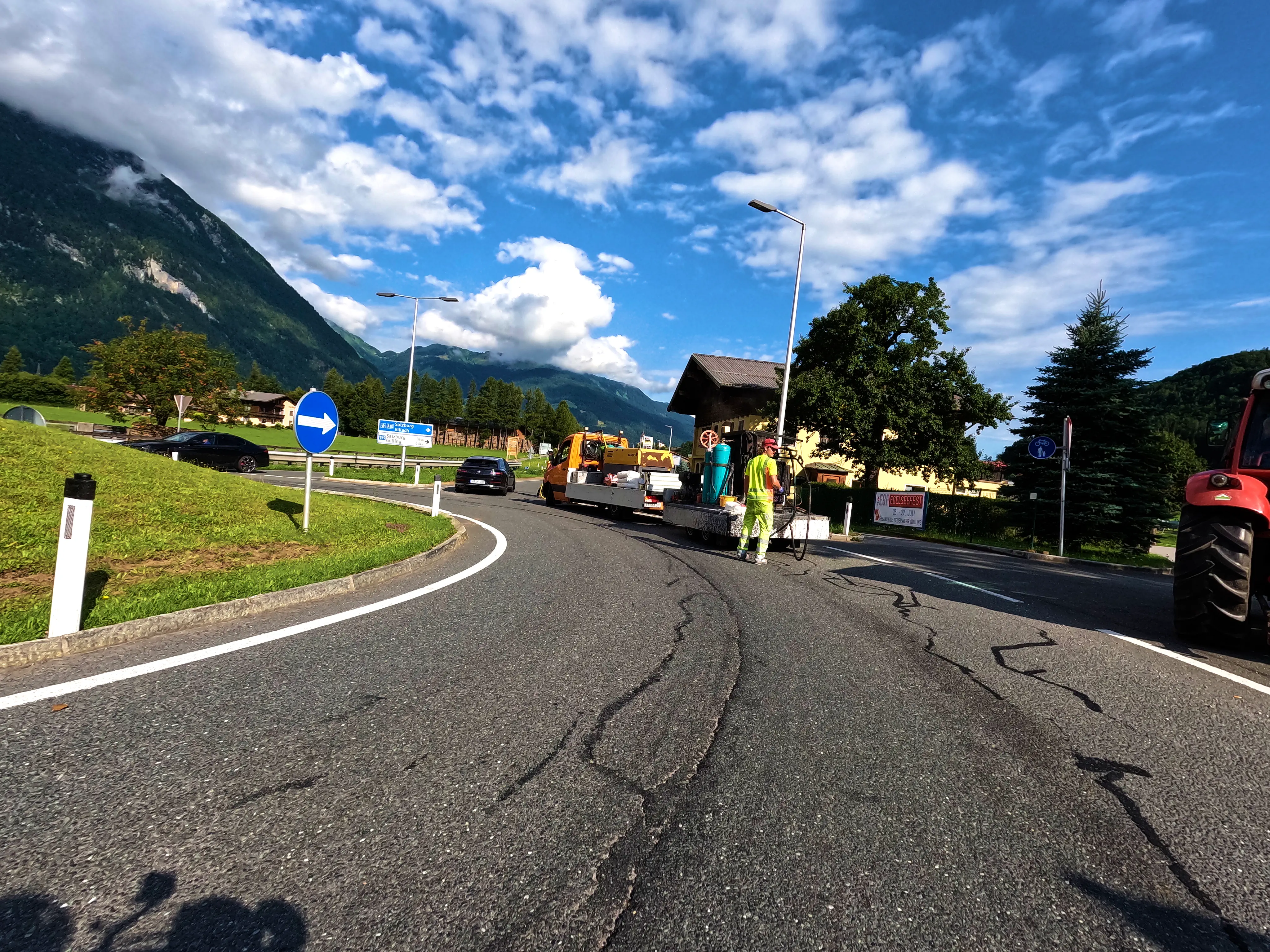 Bei Golling fuhr ich eine Tankstelle an, kurz dafür wurden jedoch noch Fehlstellen im Asphalt eines Kreisverkehrs ausgebessert. Das bremste den Verkehr etwas, die Tankstelle erreichte ich trotzdem.