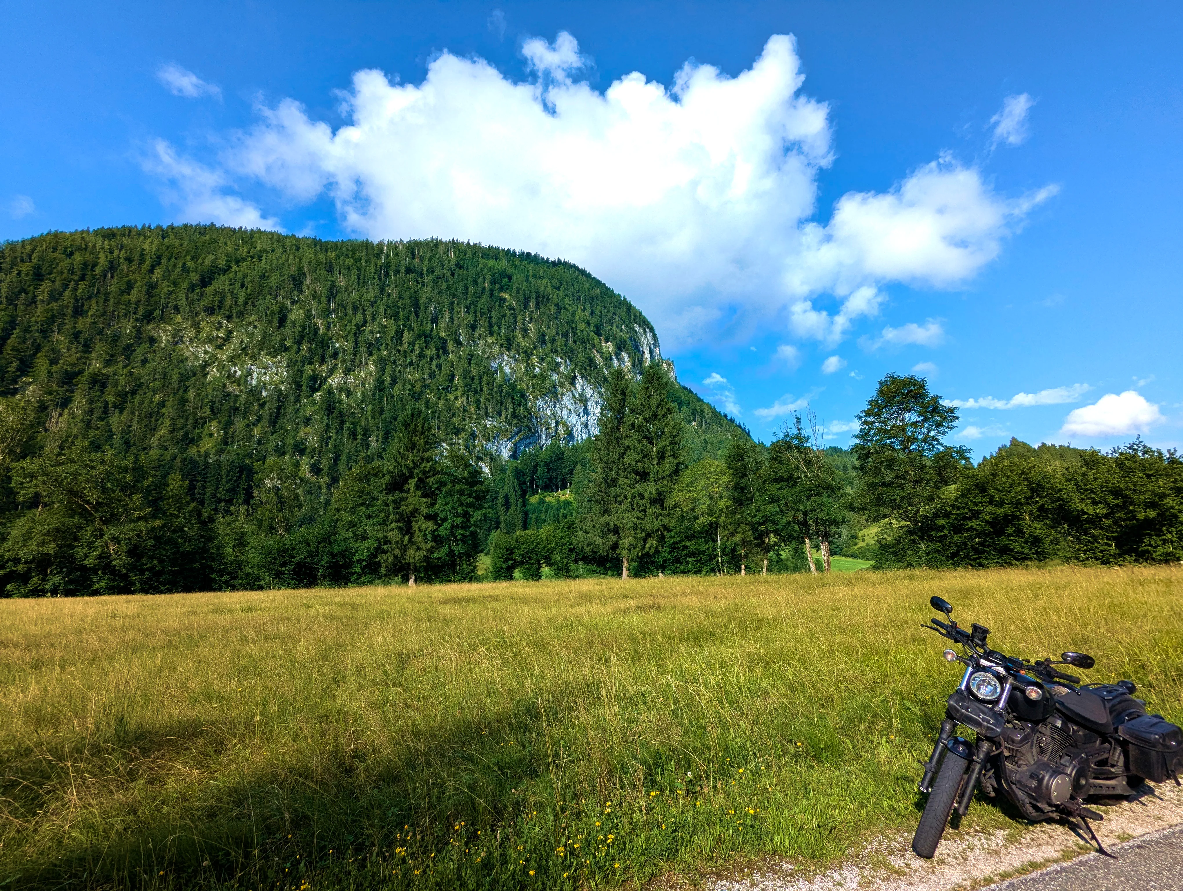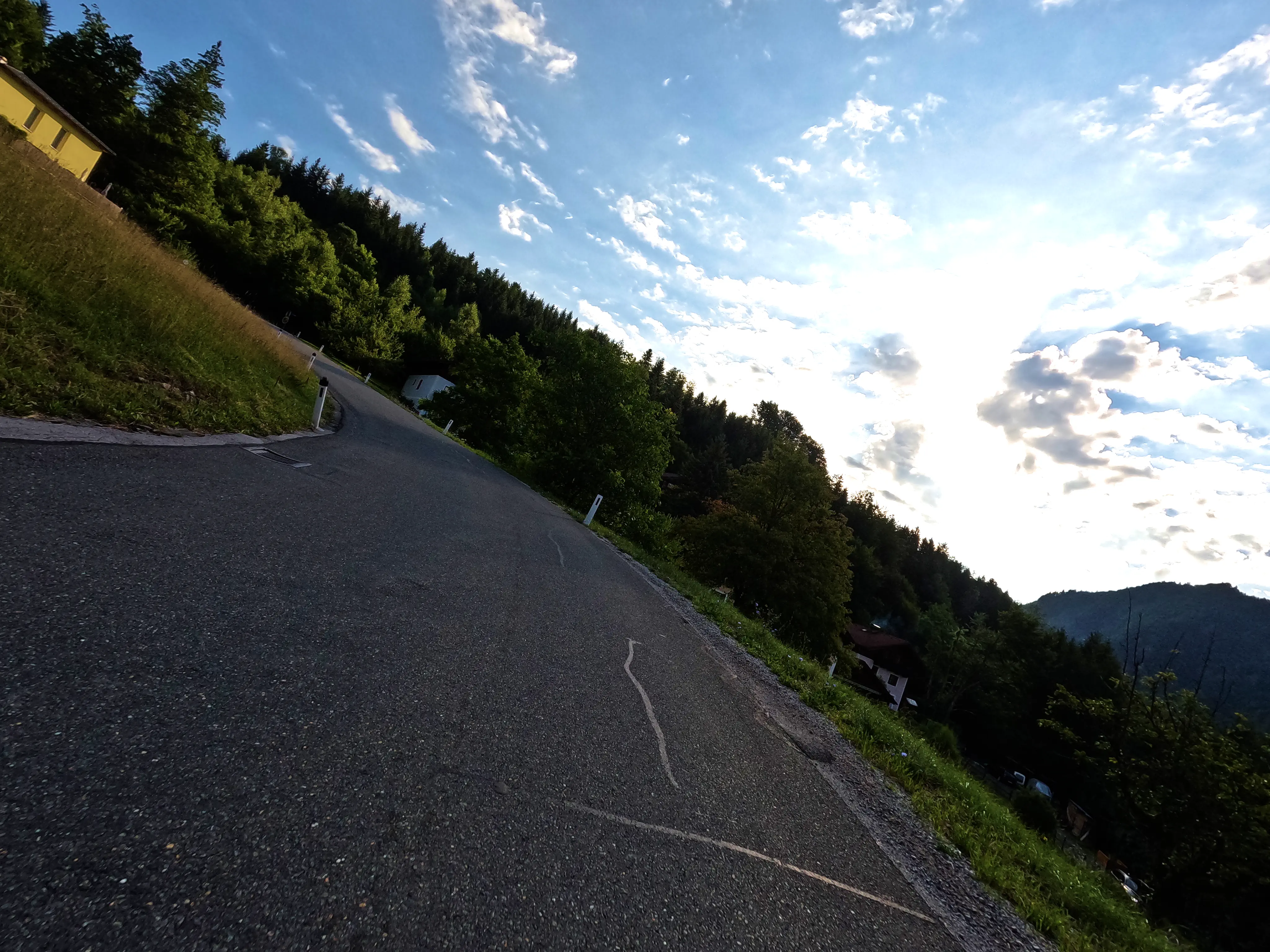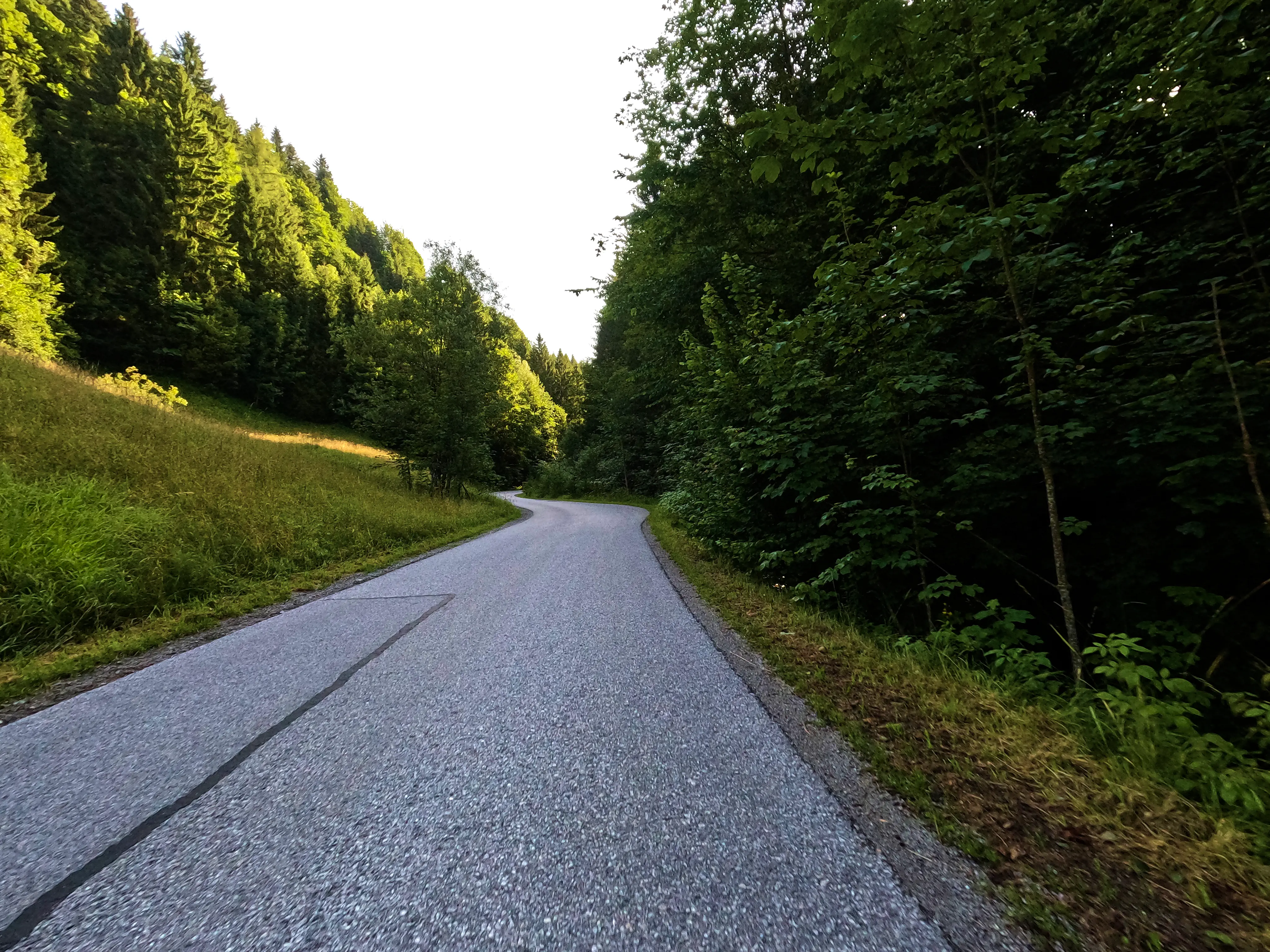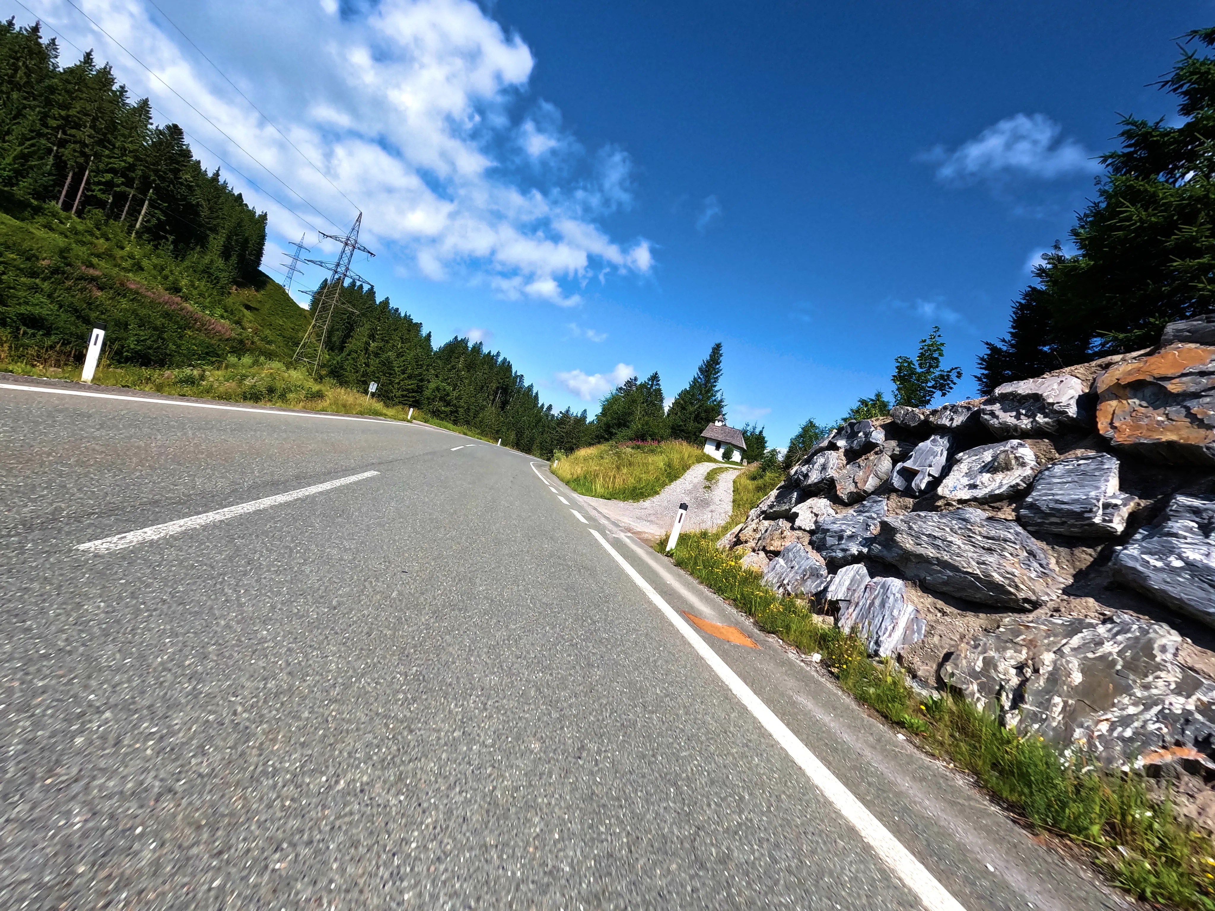 Der erste Passknacker des Tages war nun nicht mehr weit entfernt. Ich hatte bereits 155 Kilometer zurückgelegt, das erste Zwischenziel war jetzt noch ungefähr 13 Kilometer weit weg. Runter von der Autobahn, folgte ich noch ein paar Kilometer einer größeren Straße, bevor ich dann schließlich auf kleine Nebenstraßen einbog, um das erste Zwischenziel zu erreichen. Es war erst kurz nach 8 Uhr morgens, viele der kleinen Straßen lagen noch im Schatten. Dennoch boten sich mir tolle Ausblicke auf die umliegende Natur. Um halb neun war dann der erste Passknacker-Punkt des Tages erreicht, das Nachweisfoto an der kleinen Kapelle im Wald war schnell gemacht. Die letzten Jahre, als ich diesen Punkt anfuhr, drehte ich hier um, um wieder zurück Richtung Golling zu kommen - an diesem Tag fuhr ich geradeaus weiter, Richtung Pichl. Noch ein Stück weiter, und ich hätte den Lienbachsattel bzw. die Postalmstraße befahren können - dafür fehlte mir an diesem Tag jedoch die Zeit. Trotzdem war der Weg weiter Richtung Pichl und dann etwas unterhalb über die B162 zurück Richtung Golling sehr schön zu fahren, besonders das Stück bis Pichl.