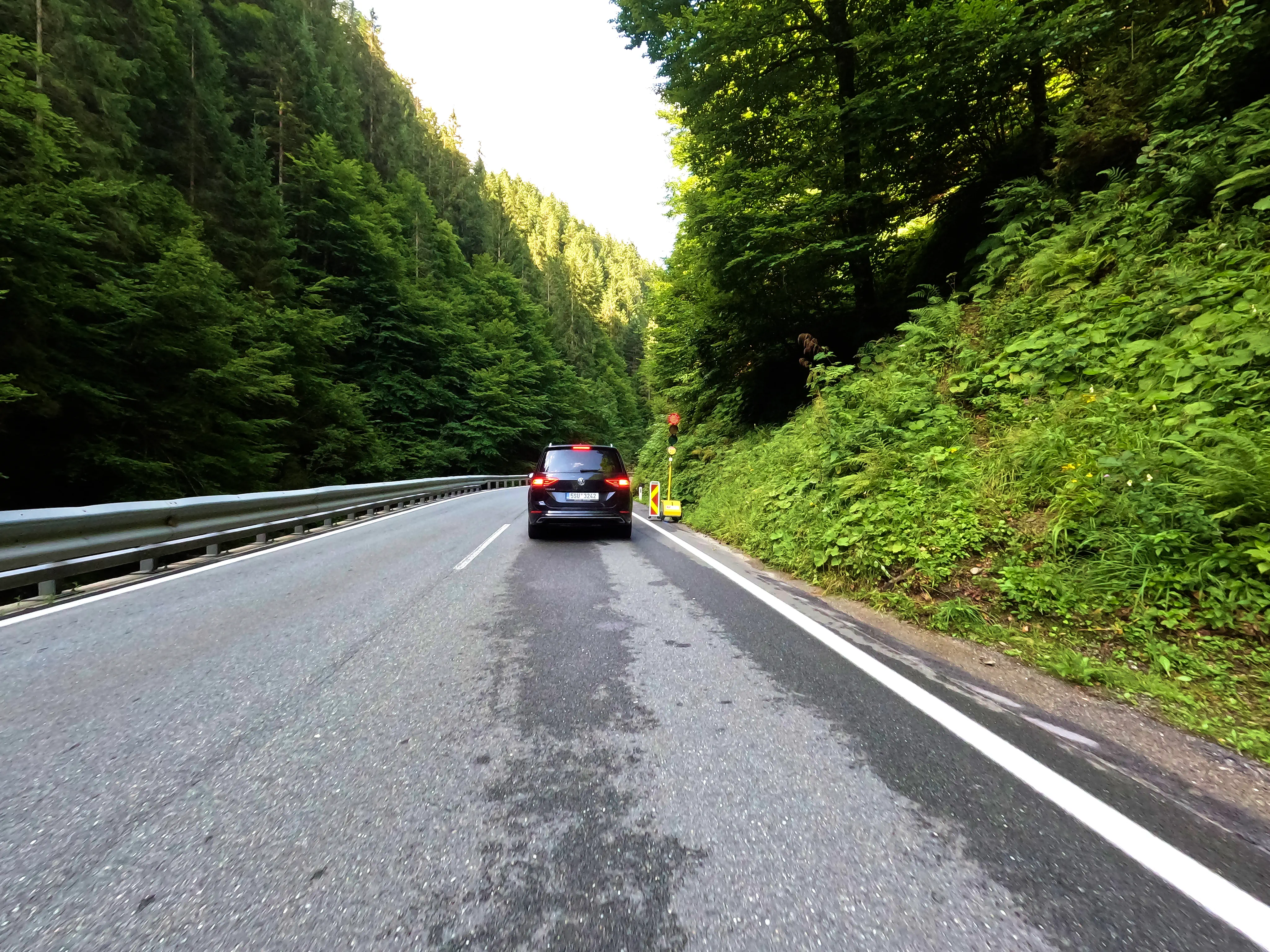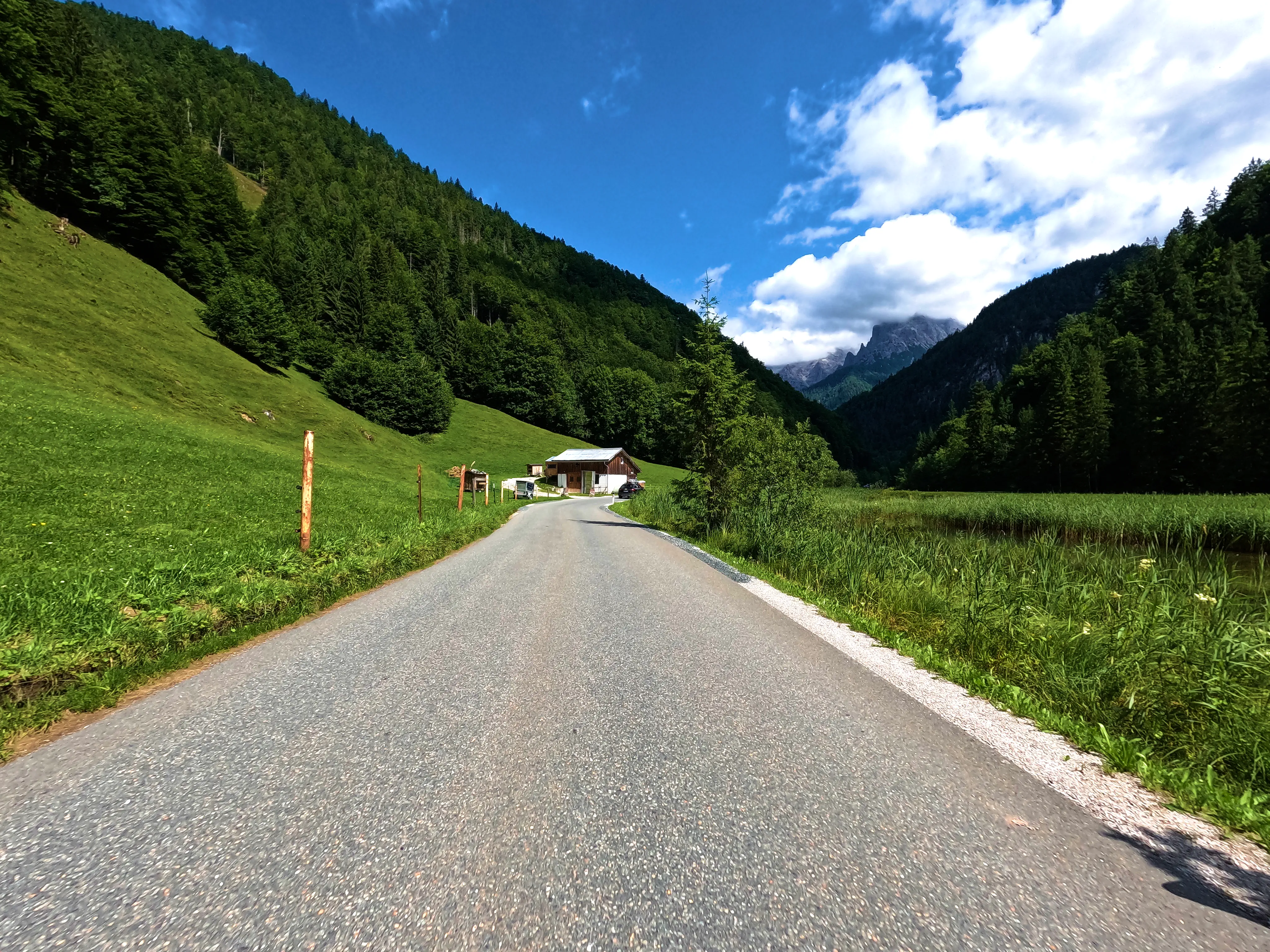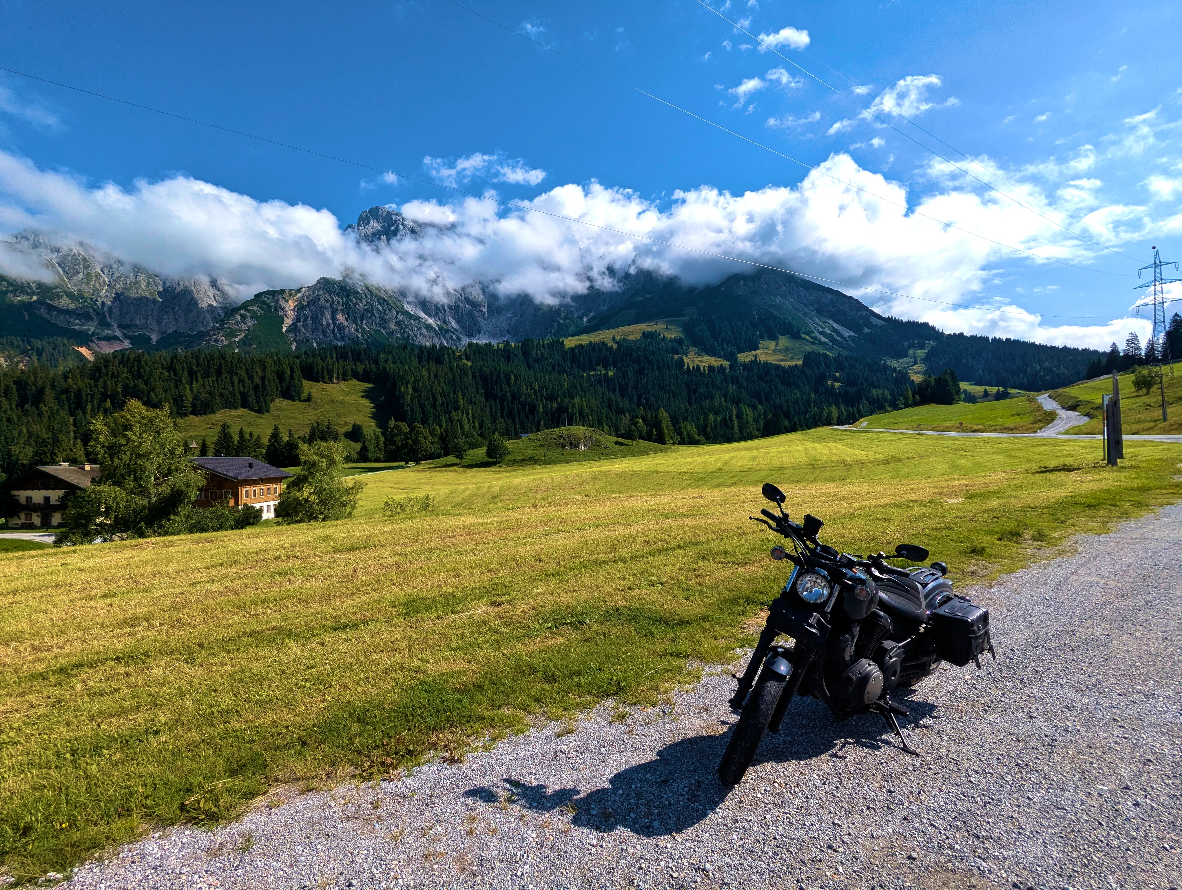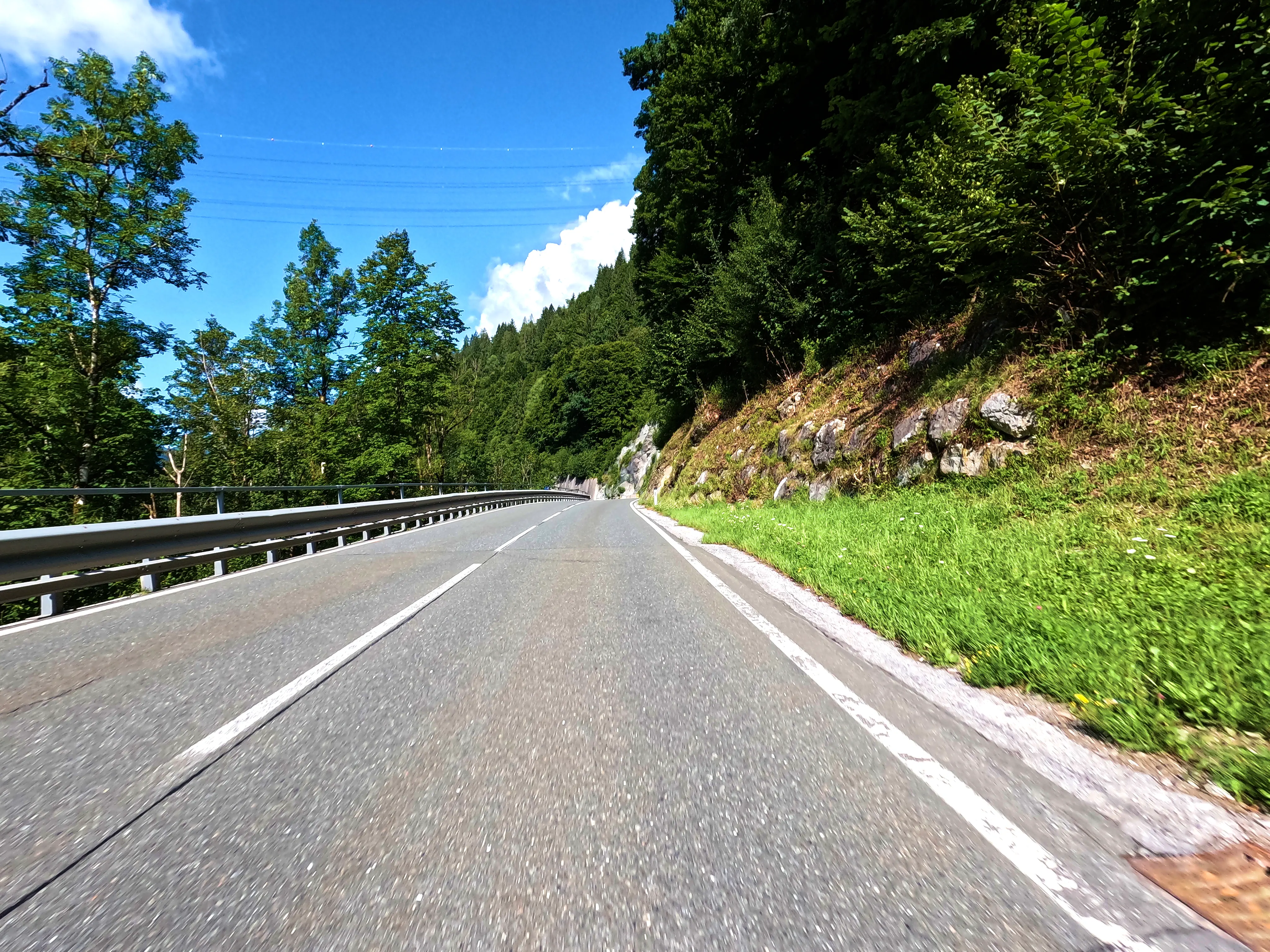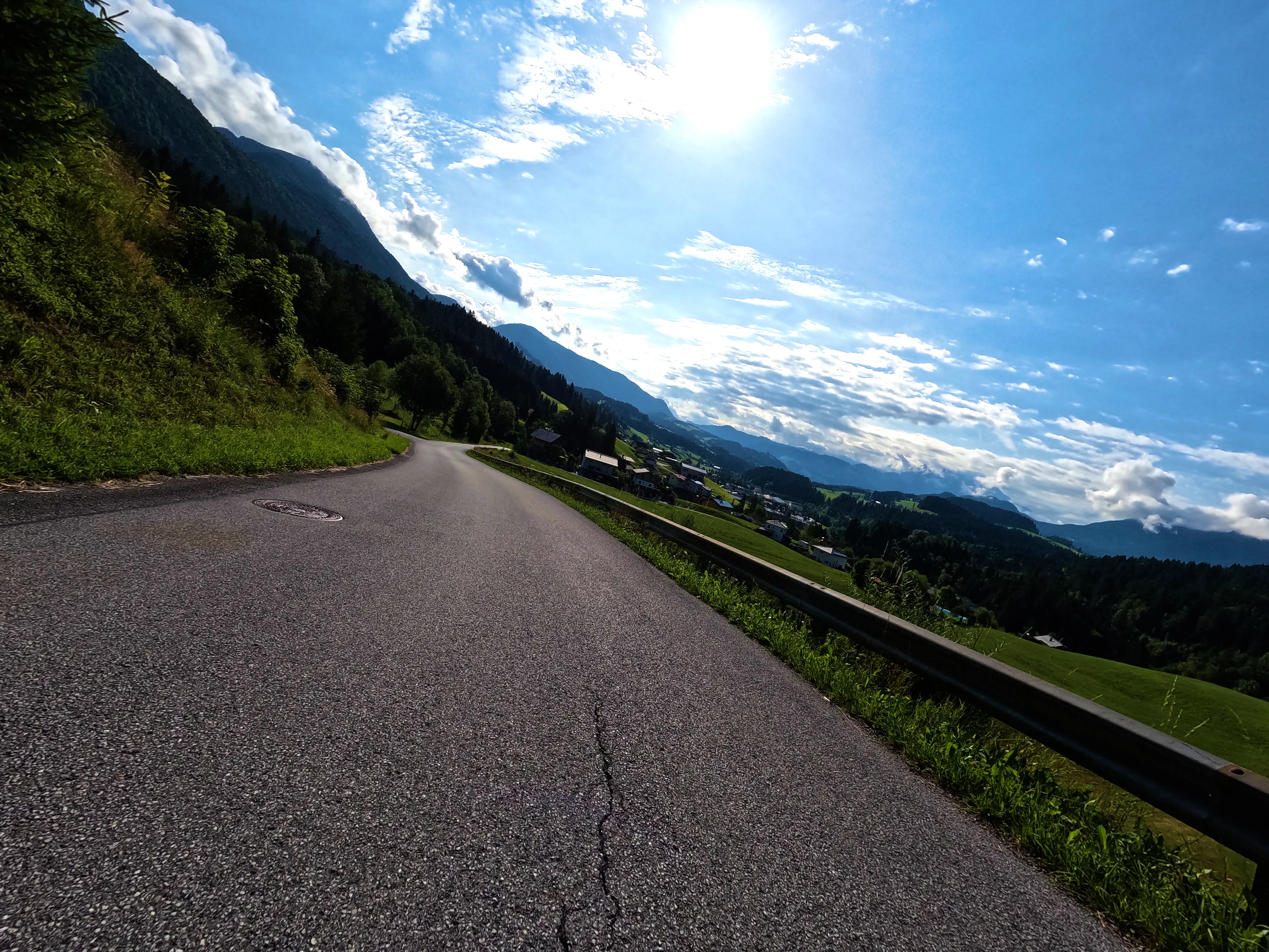 Der erste Passknacker des Tages war nun nicht mehr weit entfernt. Ich hatte bereits 155 Kilometer zurückgelegt, das erste Zwischenziel war jetzt noch ungefähr 13 Kilometer weit weg. Runter von der Autobahn, folgte ich noch ein paar Kilometer einer größeren Straße, bevor ich dann schließlich auf kleine Nebenstraßen einbog, um das erste Zwischenziel zu erreichen. Es war erst kurz nach 8 Uhr morgens, viele der kleinen Straßen lagen noch im Schatten. Dennoch boten sich mir tolle Ausblicke auf die umliegende Natur. Um halb neun war dann der erste Passknacker-Punkt des Tages erreicht, das Nachweisfoto an der kleinen Kapelle im Wald war schnell gemacht. Die letzten Jahre, als ich diesen Punkt anfuhr, drehte ich hier um, um wieder zurück Richtung Golling zu kommen - an diesem Tag fuhr ich geradeaus weiter, Richtung Pichl. Noch ein Stück weiter, und ich hätte den Lienbachsattel bzw. die Postalmstraße befahren können - dafür fehlte mir an diesem Tag jedoch die Zeit. Trotzdem war der Weg weiter Richtung Pichl und dann etwas unterhalb über die B162 zurück Richtung Golling sehr schön zu fahren, besonders das Stück bis Pichl.