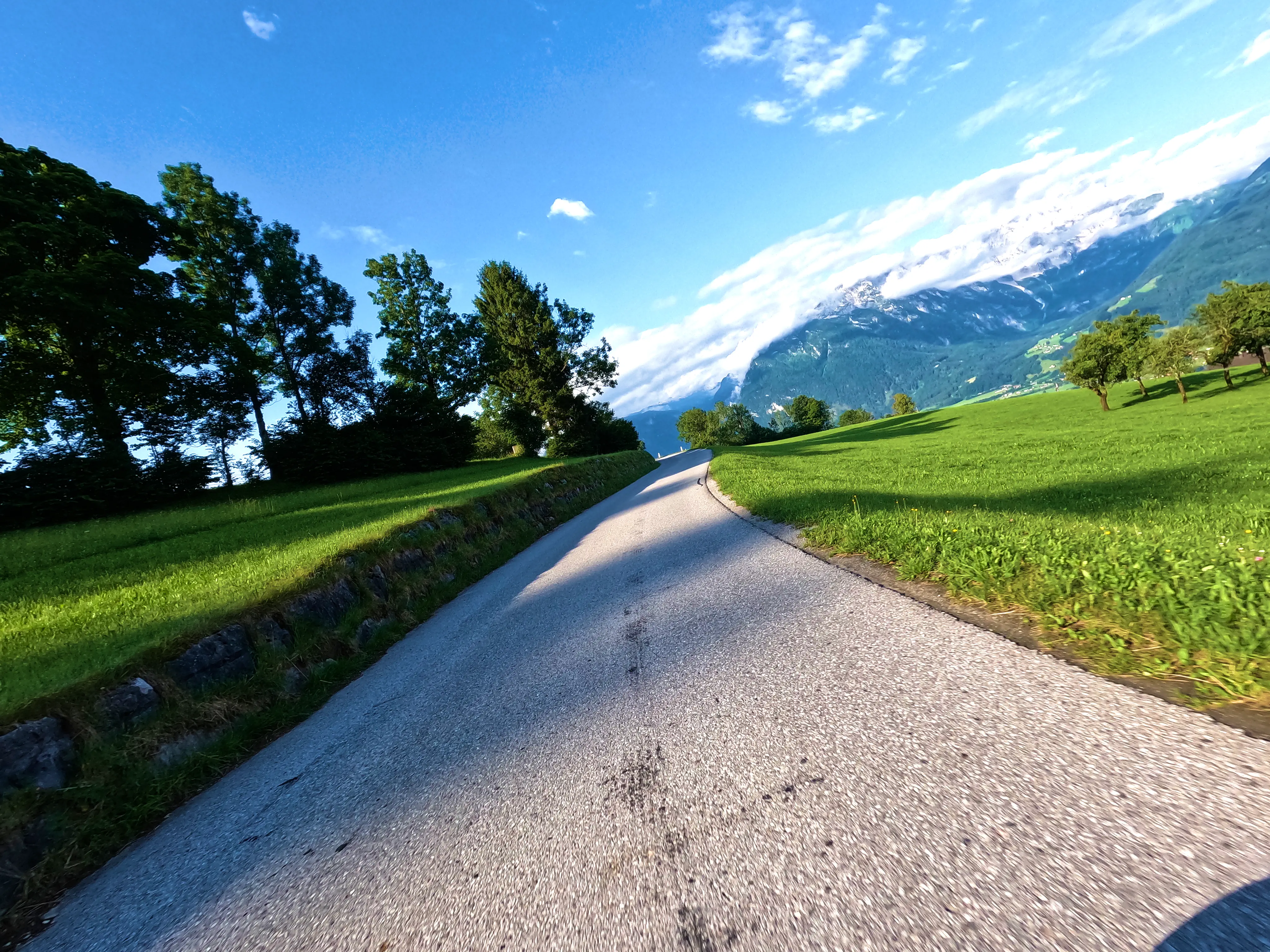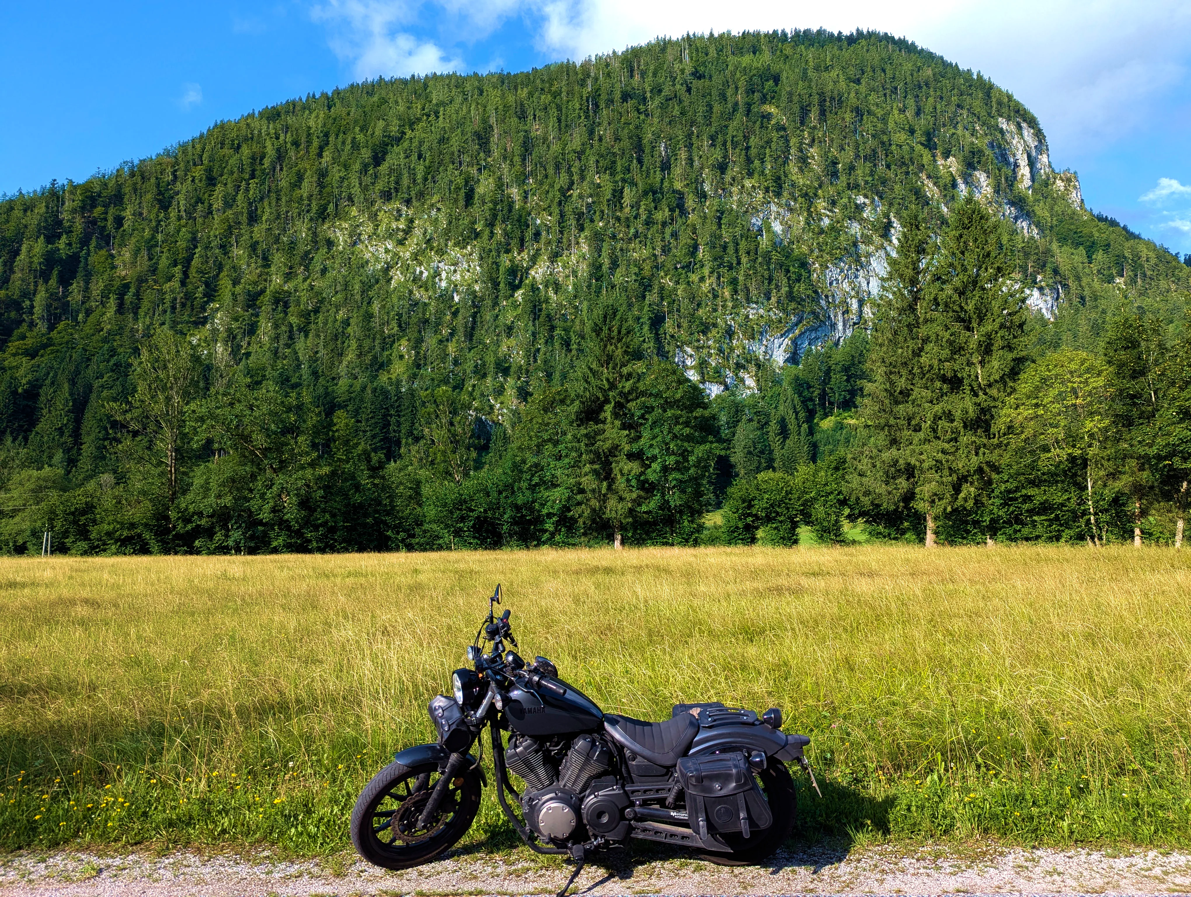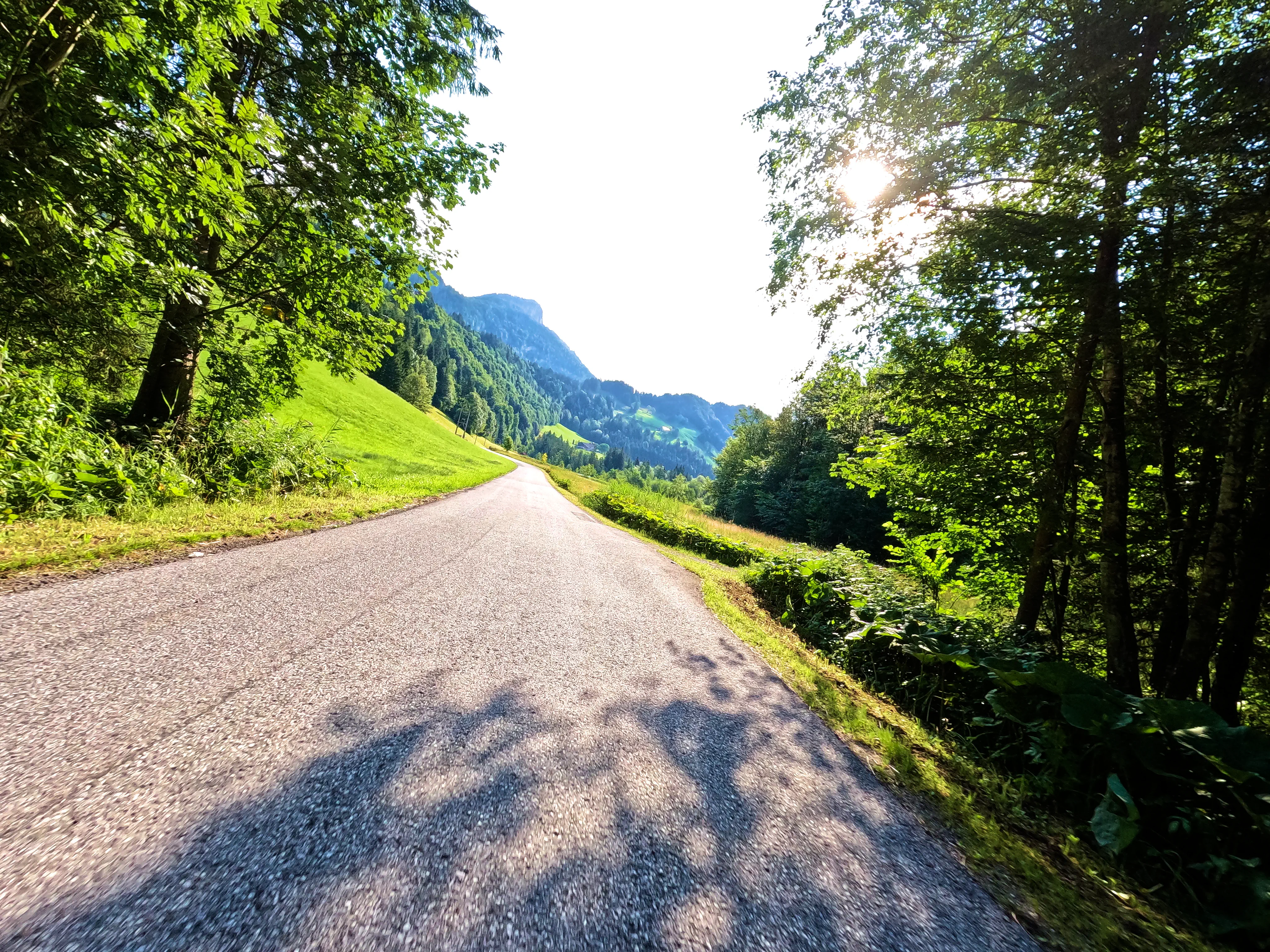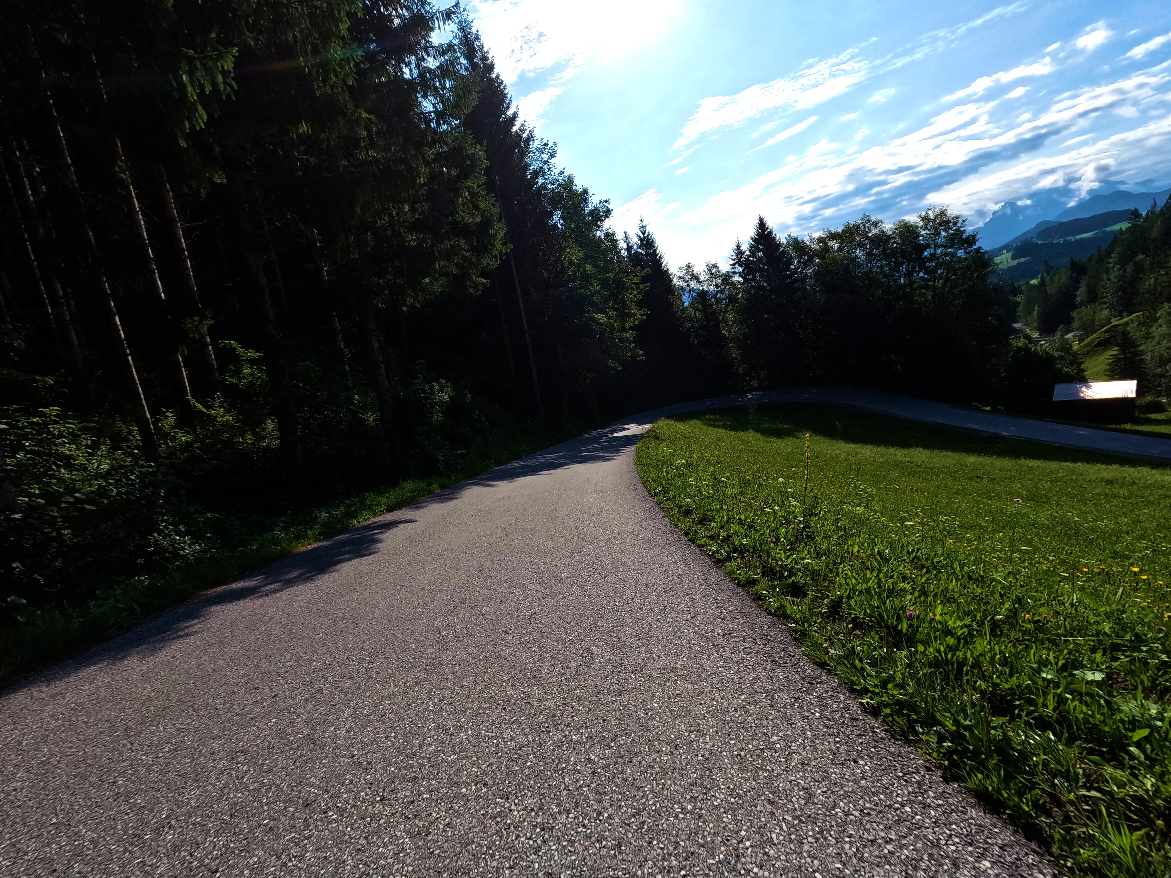 Der erste Passknacker des Tages war nun nicht mehr weit entfernt. Ich hatte bereits 155 Kilometer zurückgelegt, das erste Zwischenziel war jetzt noch ungefähr 13 Kilometer weit weg. Runter von der Autobahn, folgte ich noch ein paar Kilometer einer größeren Straße, bevor ich dann schließlich auf kleine Nebenstraßen einbog, um das erste Zwischenziel zu erreichen. Es war erst kurz nach 8 Uhr morgens, viele der kleinen Straßen lagen noch im Schatten. Dennoch boten sich mir tolle Ausblicke auf die umliegende Natur. Um halb neun war dann der erste Passknacker-Punkt des Tages erreicht, das Nachweisfoto an der kleinen Kapelle im Wald war schnell gemacht. Die letzten Jahre, als ich diesen Punkt anfuhr, drehte ich hier um, um wieder zurück Richtung Golling zu kommen - an diesem Tag fuhr ich geradeaus weiter, Richtung Pichl. Noch ein Stück weiter, und ich hätte den Lienbachsattel bzw. die Postalmstraße befahren können - dafür fehlte mir an diesem Tag jedoch die Zeit. Trotzdem war der Weg weiter Richtung Pichl und dann etwas unterhalb über die B162 zurück Richtung Golling sehr schön zu fahren, besonders das Stück bis Pichl.