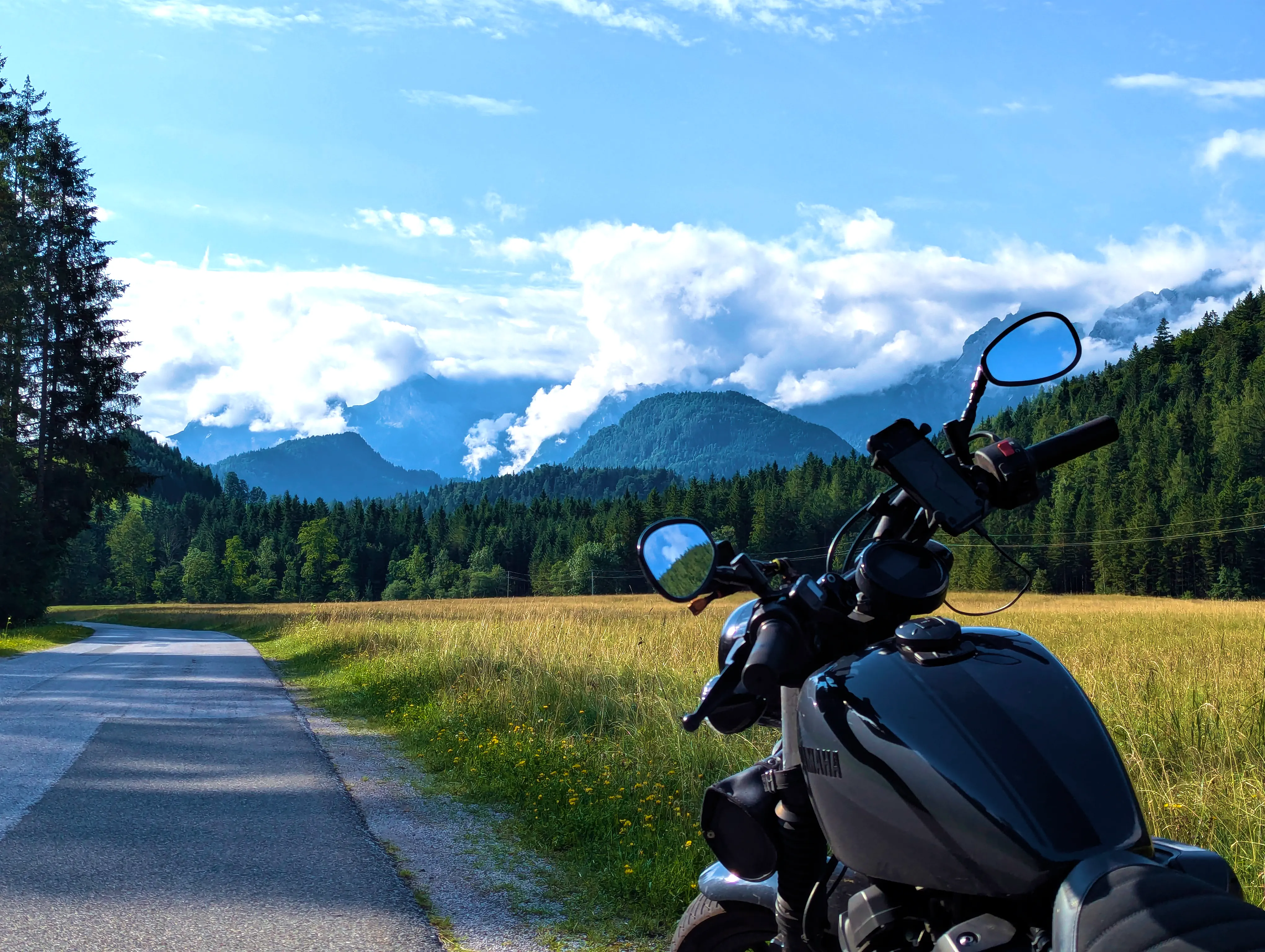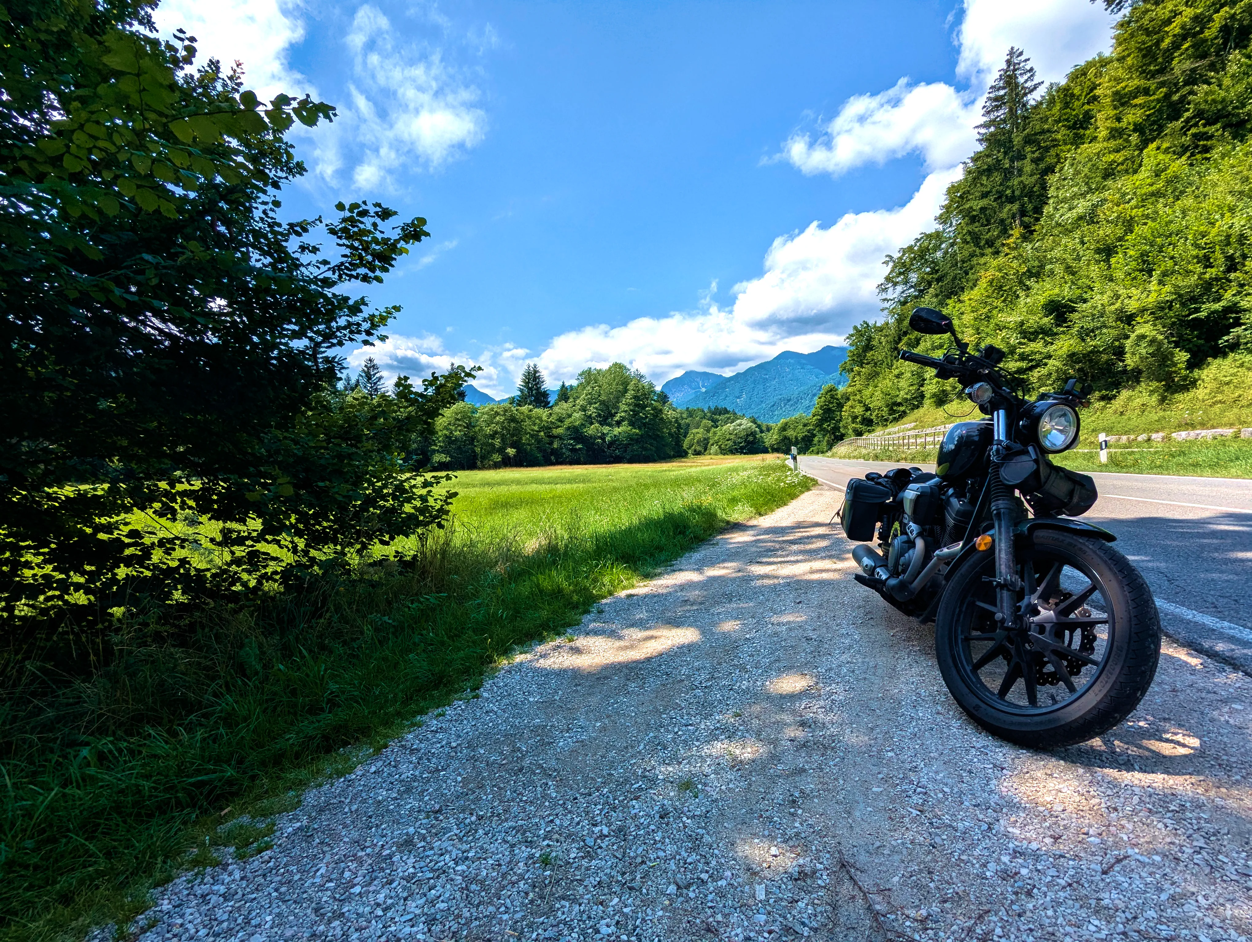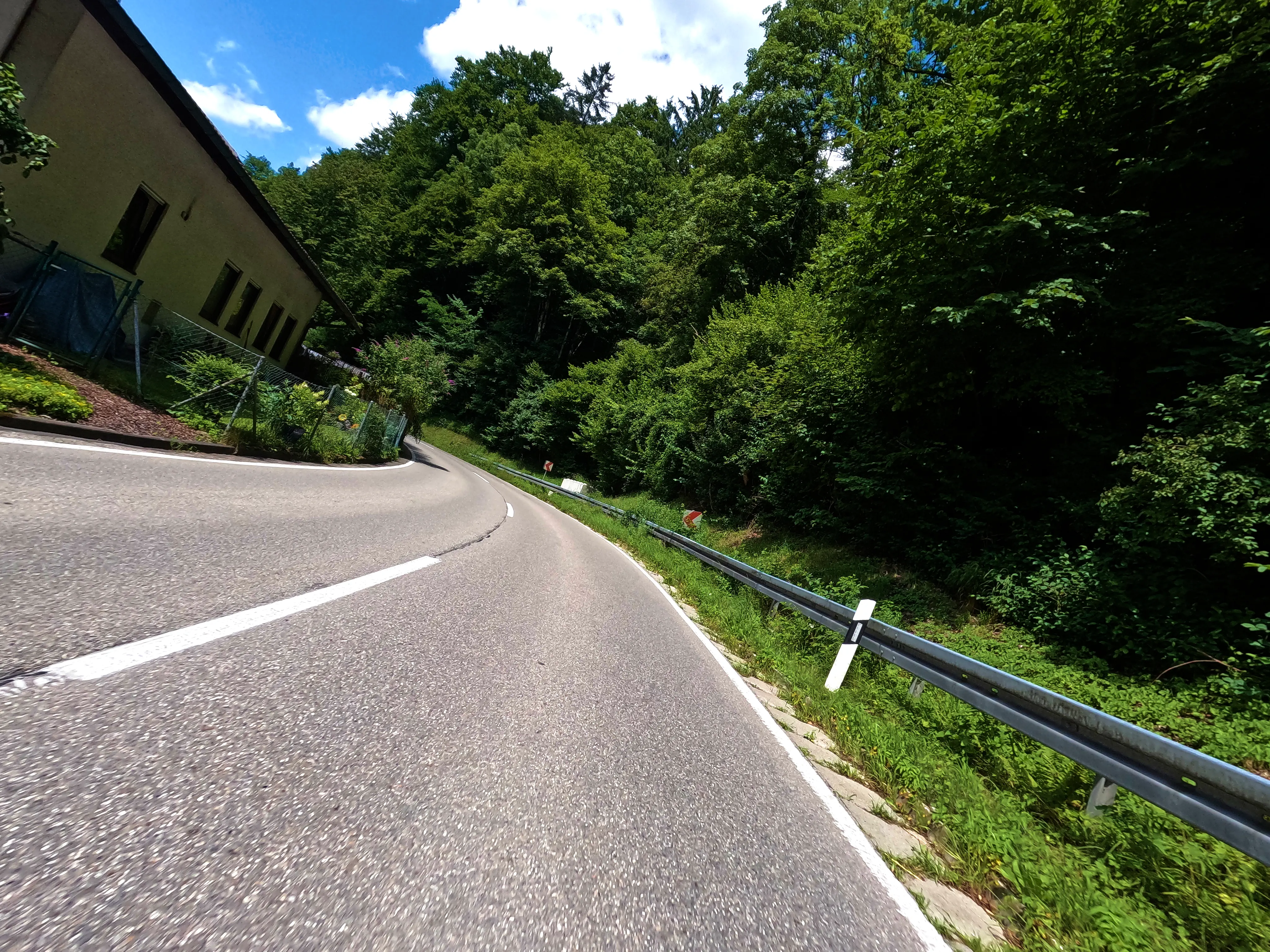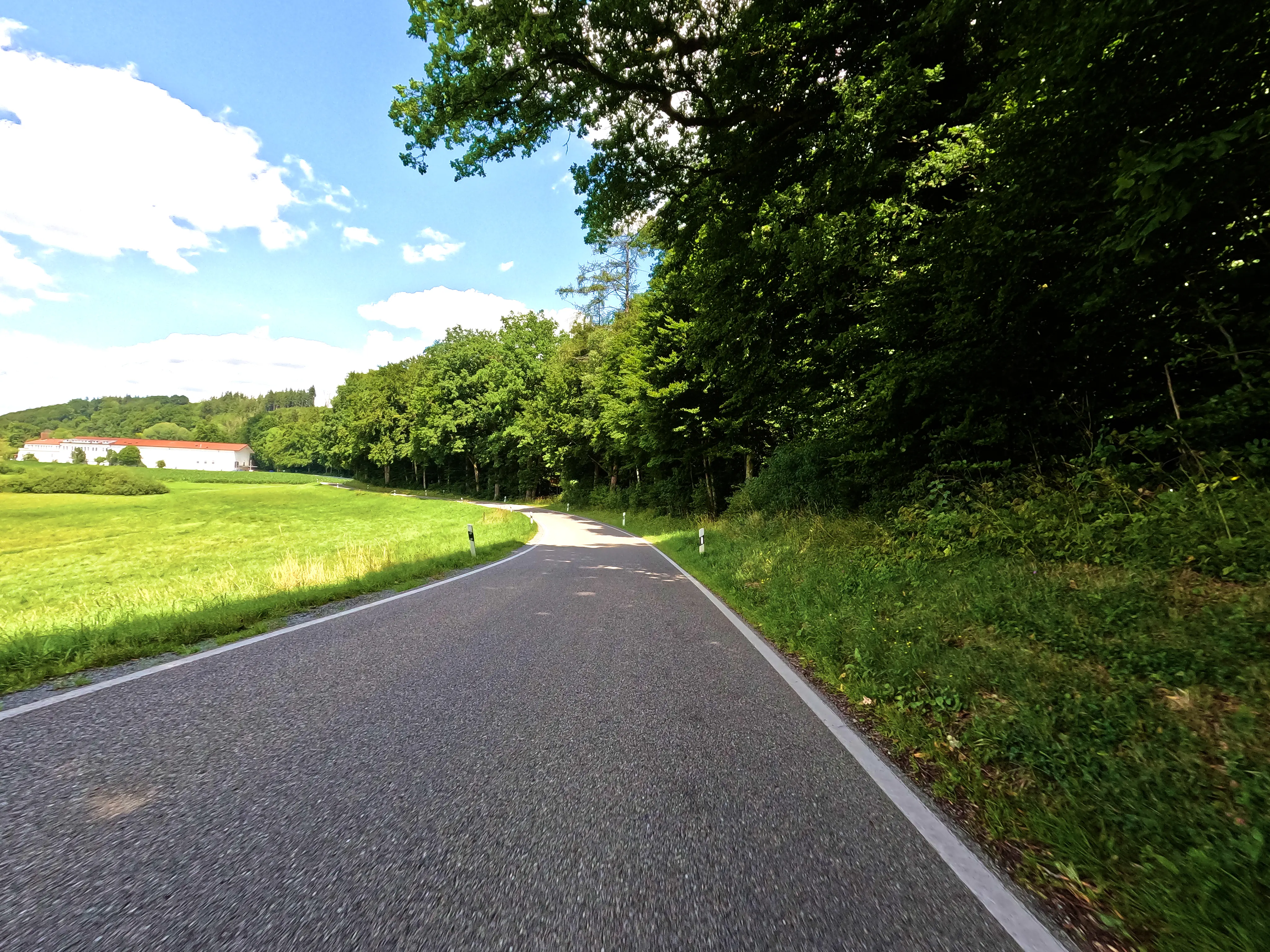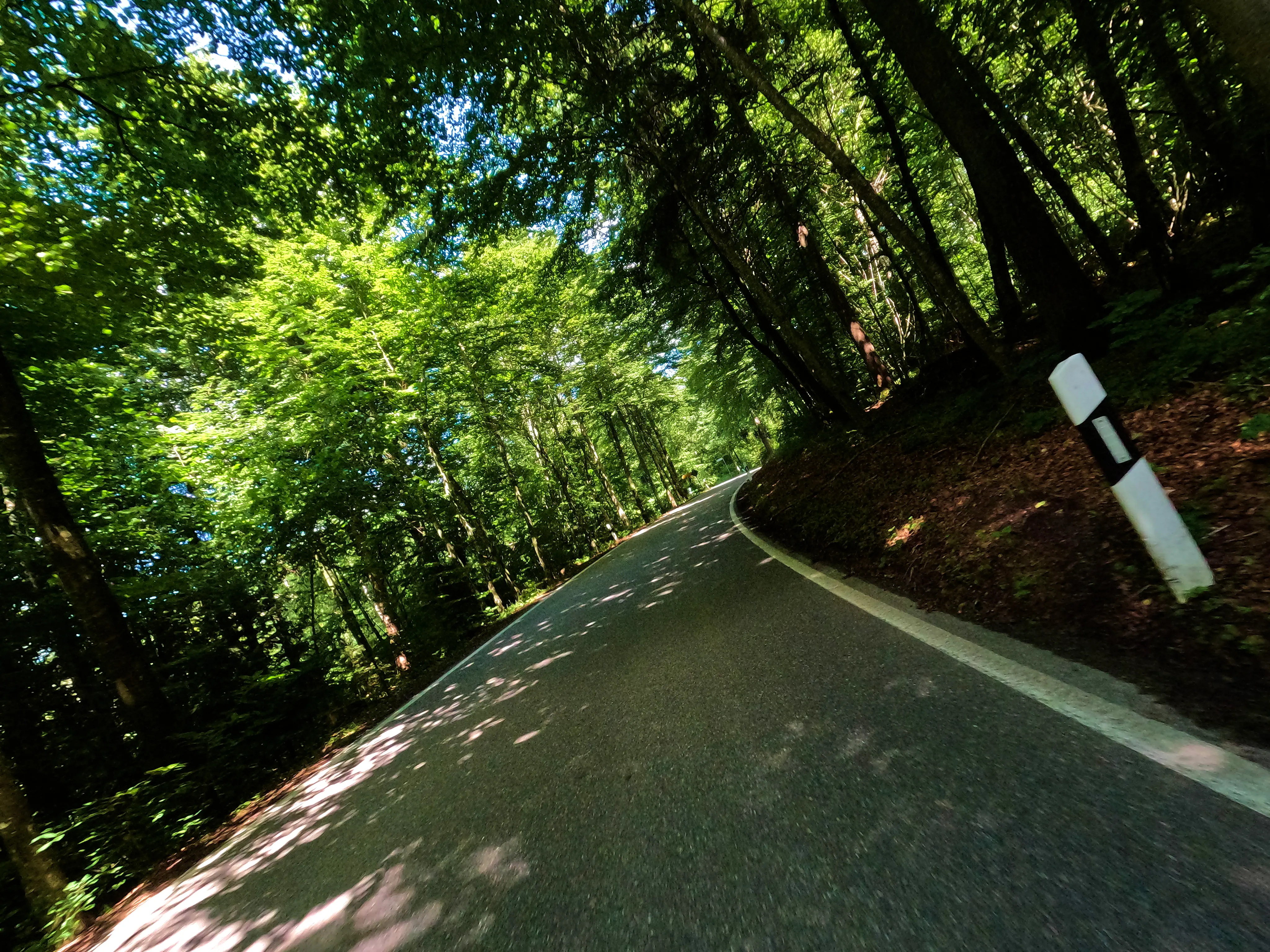 Der erste Passknacker des Tages war nun nicht mehr weit entfernt. Ich hatte bereits 155 Kilometer zurückgelegt, das erste Zwischenziel war jetzt noch ungefähr 13 Kilometer weit weg. Runter von der Autobahn, folgte ich noch ein paar Kilometer einer größeren Straße, bevor ich dann schließlich auf kleine Nebenstraßen einbog, um das erste Zwischenziel zu erreichen. Es war erst kurz nach 8 Uhr morgens, viele der kleinen Straßen lagen noch im Schatten. Dennoch boten sich mir tolle Ausblicke auf die umliegende Natur. Um halb neun war dann der erste Passknacker-Punkt des Tages erreicht, das Nachweisfoto an der kleinen Kapelle im Wald war schnell gemacht. Die letzten Jahre, als ich diesen Punkt anfuhr, drehte ich hier um, um wieder zurück Richtung Golling zu kommen - an diesem Tag fuhr ich geradeaus weiter, Richtung Pichl. Noch ein Stück weiter, und ich hätte den Lienbachsattel bzw. die Postalmstraße befahren können - dafür fehlte mir an diesem Tag jedoch die Zeit. Trotzdem war der Weg weiter Richtung Pichl und dann etwas unterhalb über die B162 zurück Richtung Golling sehr schön zu fahren, besonders das Stück bis Pichl.