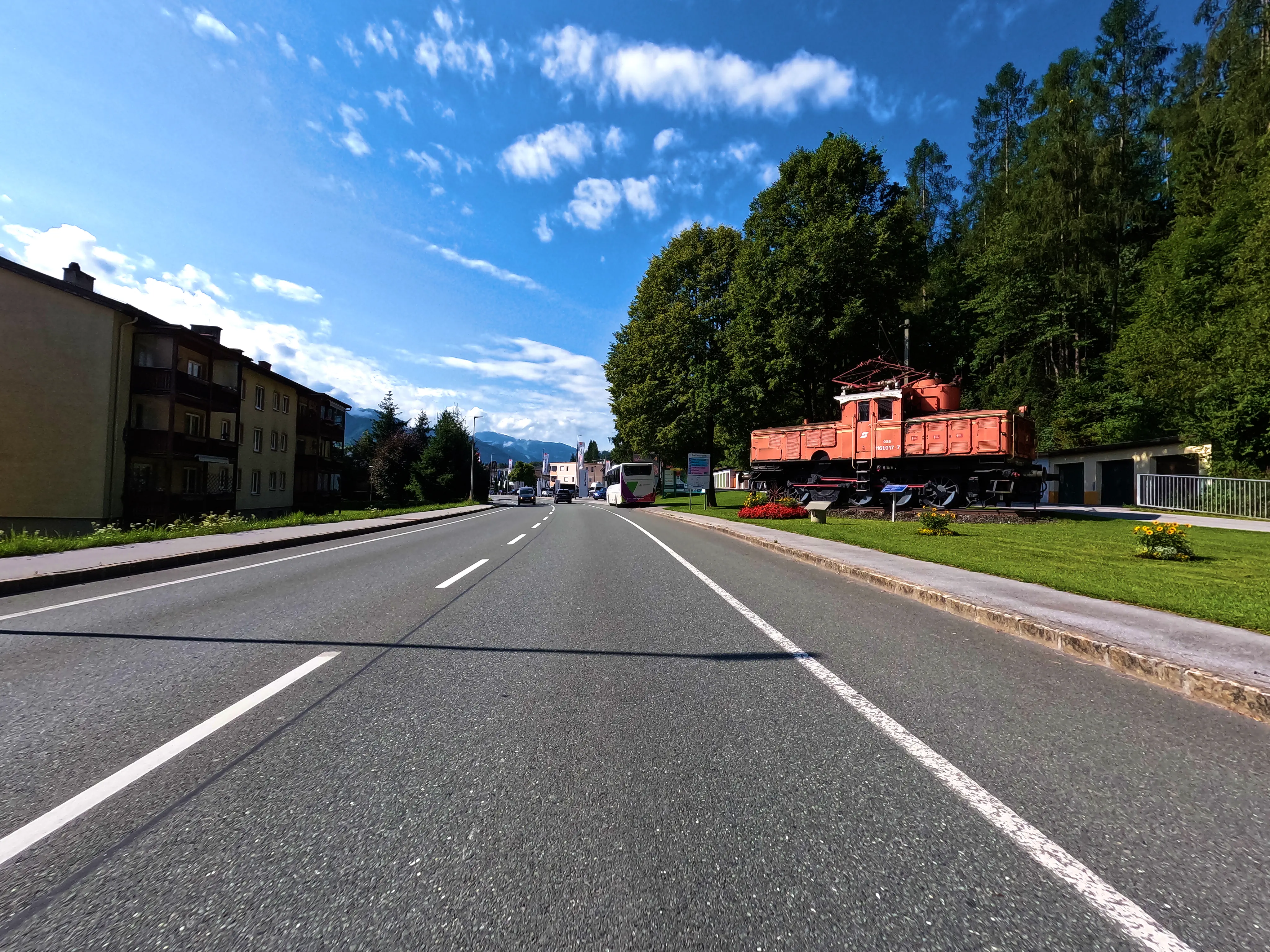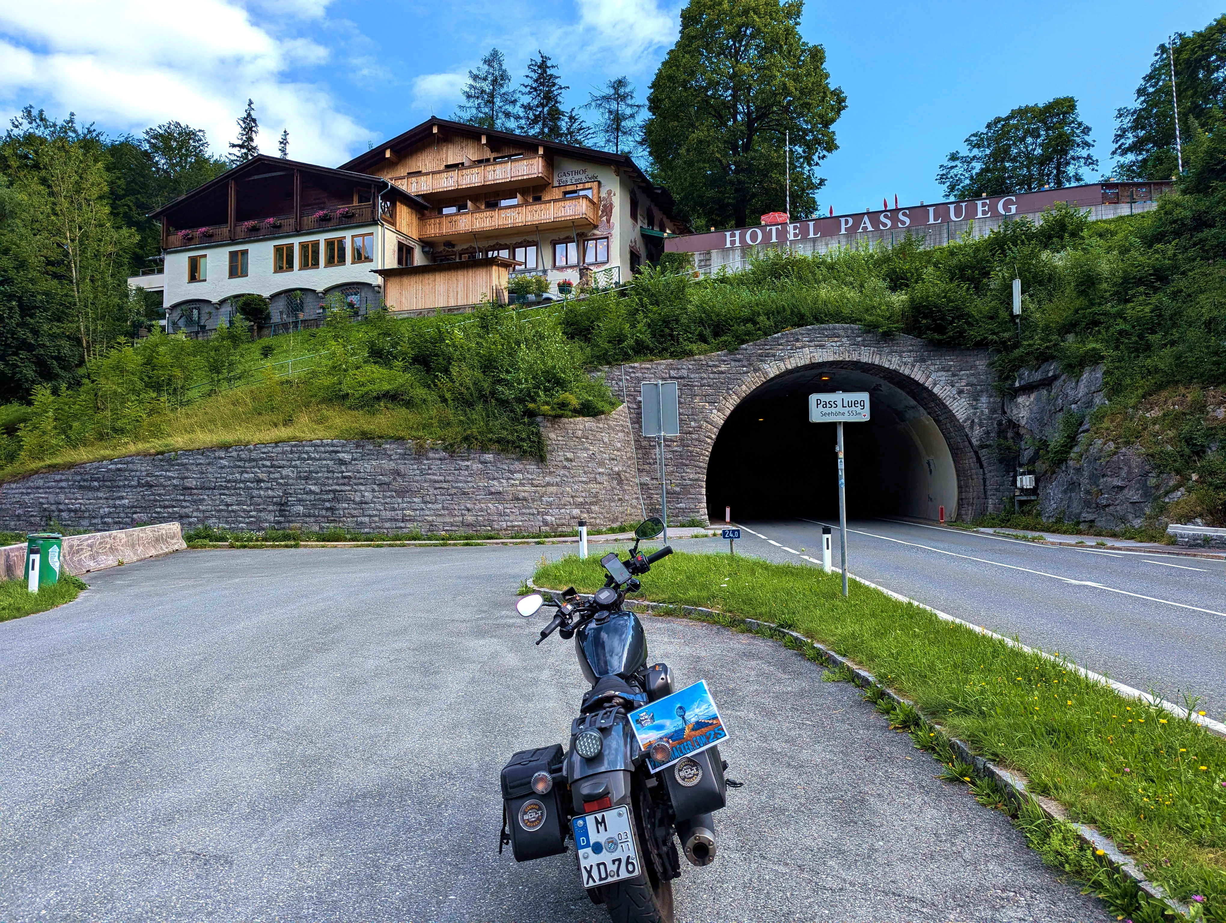 Mit vollem Tank ging es zum nächsten Ziel, dem Pass Lueg. Dieser war über die B159 nur 3 Kilometer von der Tankstelle entfernt. Ich hielt in der Parkbucht am Tunnel mit Blick auf das Hotel, um mein Nachweisfoto zu knipsen. Von hier aus ging es weiter über die B159 in Richtung Süden, vorbei an der Festung Hohenwerfen bis Bischofshofen.