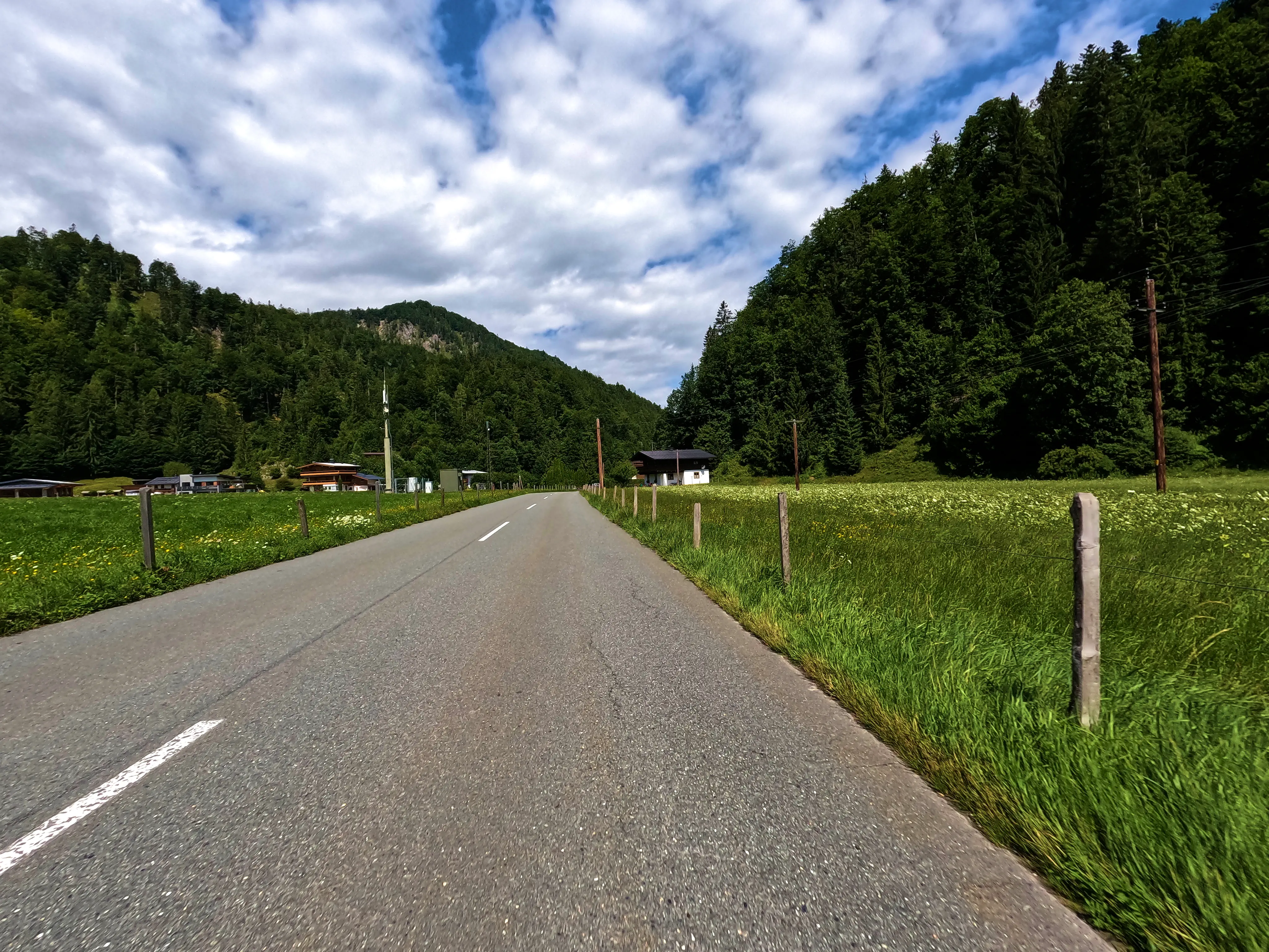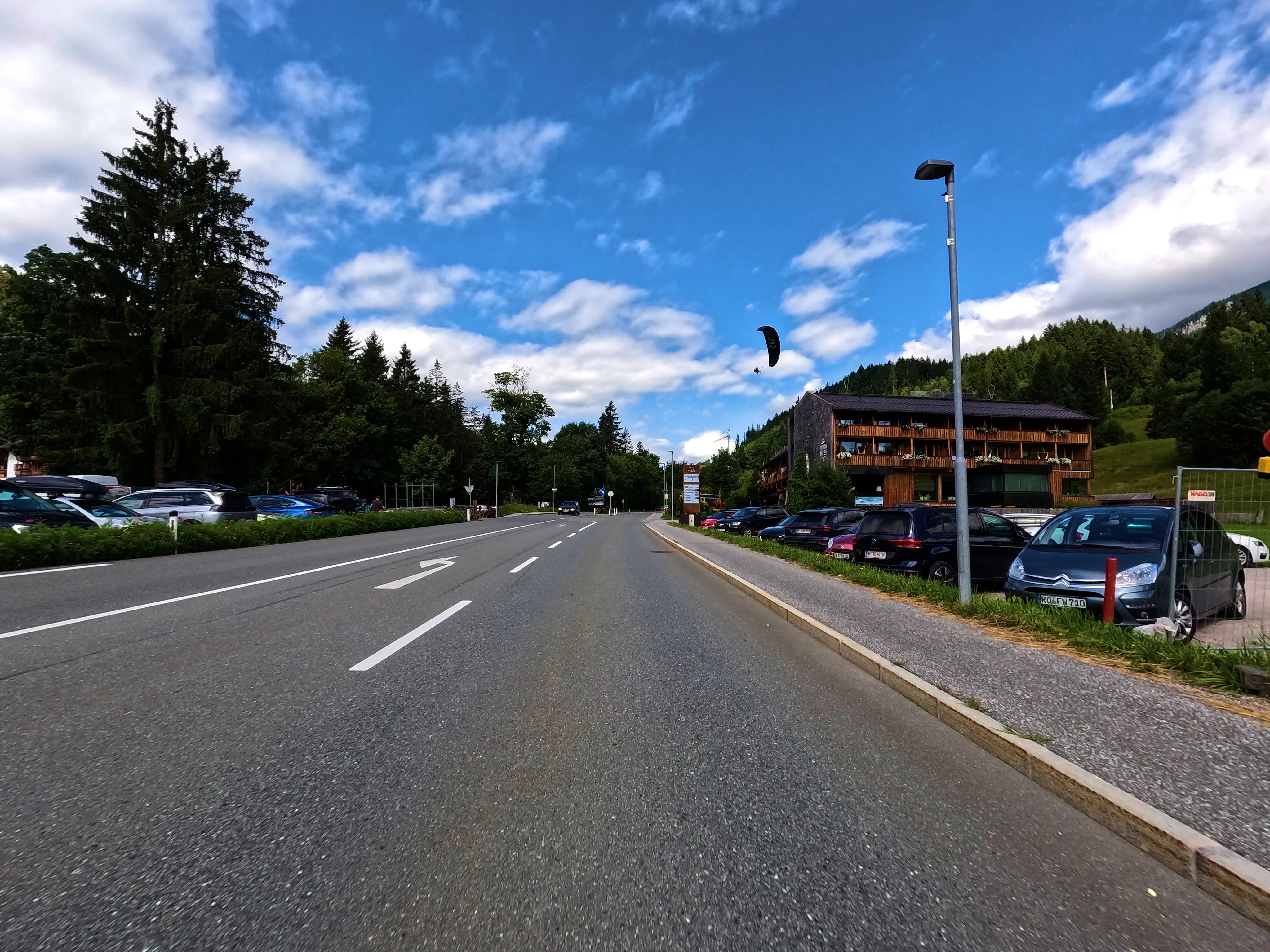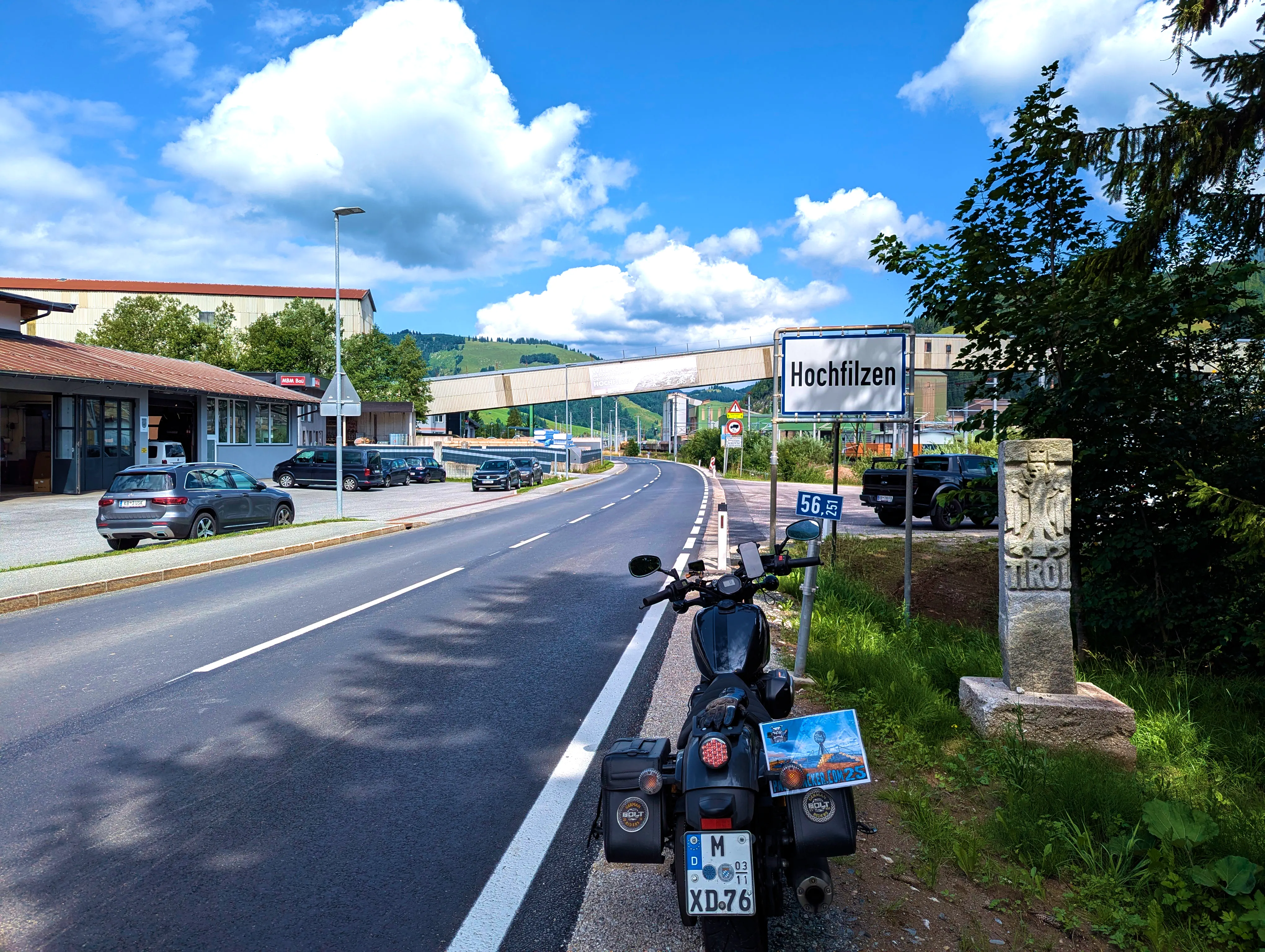 In Saalfelden war der Verkehr etwas fordernd, doch irgendwann war auch der Ort durchquert. Für mich ging es weiter in Richtung Westen, das nächste Ziel sollte der Grießenpass sein. Dieser liegt recht unauffällig ebenfalls an der B164. Auf dem Weg dorthin hatte ich kurz Sorge, dass ein Gleitschirmflieger auf der Straße oder auf dem Dach eines Hauses landen würde, er hat es aber sicher auf eine Wiese geschafft. Diesmal nutze ich nicht das Passschild des Grießenpasses als Nachweismotiv: Aufgrund einer Baustelle war der Verkehr am Passschild doch sehr stark, deswegen wollte ich hier nicht halten. Somit nutze ich das nächste Ortsschild (»Hochfilzen«) als Nachweismotiv, was kein Problem darstellte.