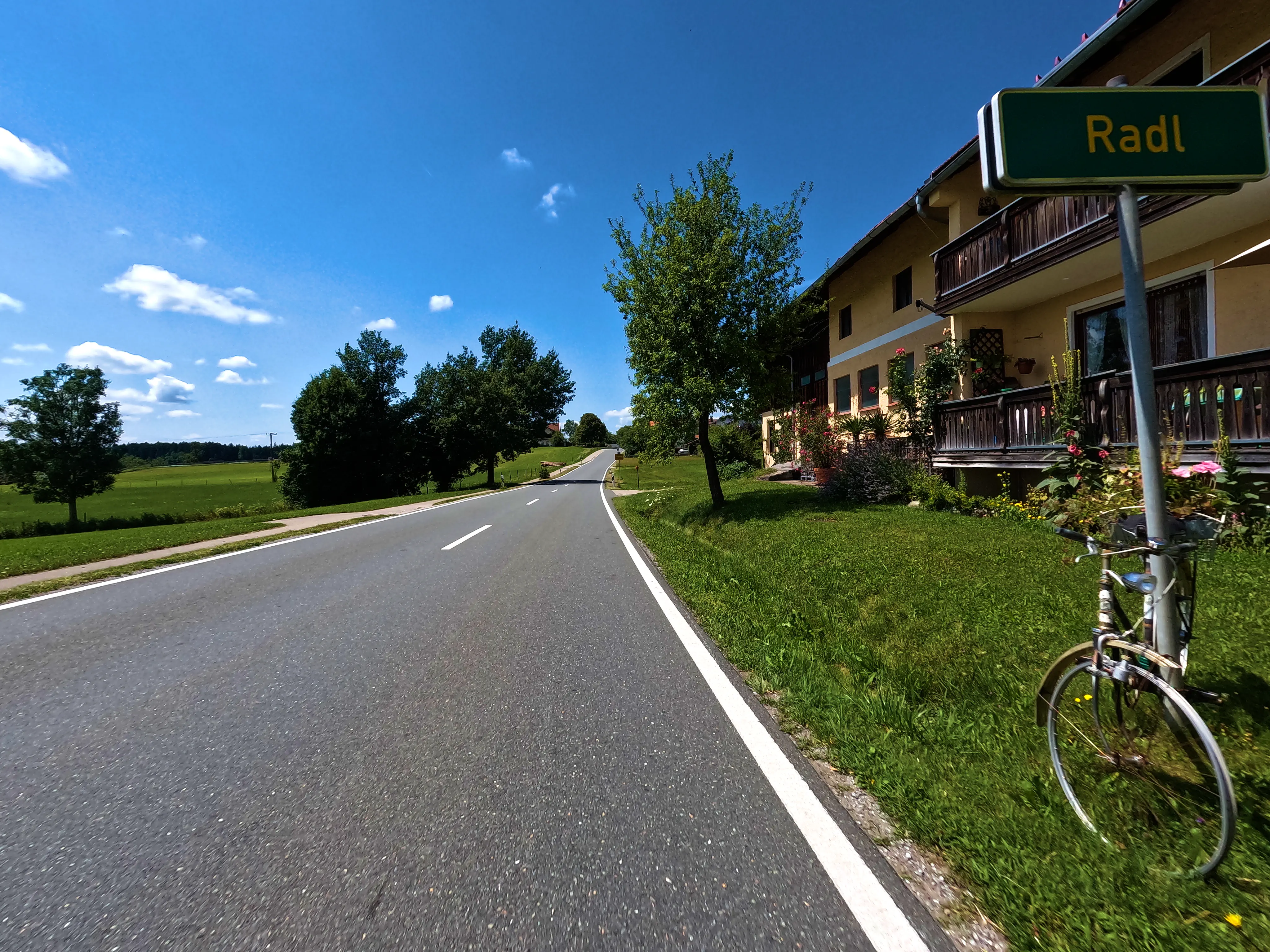 Als ich den Felstunnel durchfahren hatte, war ich bereits in Bayern. Ein paar hundert Meter weiter stand ein Container, der wohl eine Grenzkontrolle darstellen sollte - hier war jedoch niemand, somit wurde auch niemand kontrolliert. Für mich ging es nun wieder nach Hause, diesmal allerdings ohne Autobahn. Ich fuhr über Marquartstein, Grassau, Bernau und Prien am Chiemsee vorbei, umfuhr Bad Endorf und kam schließlich zwischen Höslwang und Halfing mal wieder am Weiler »Radl« vorbei. Am Schild stand auch wieder ein Fahrrad. Bei Griesstätt ging es über den Inn, anschließend noch durch Grafing und von Glonn an über die Hausstrecke zur heimischen Tankstelle.